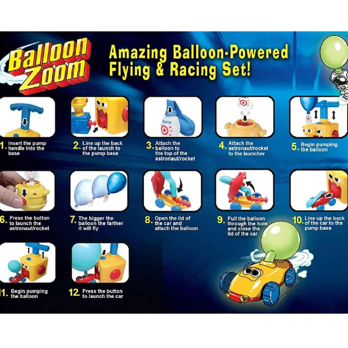 Increíble juego de carreras, solo tienes que inflar el globo y lanzar el coche, no necesita pilas ni cargadores. Con el sistema Easy Connect tendrás un máximo impulso gracias al sellado hermético.