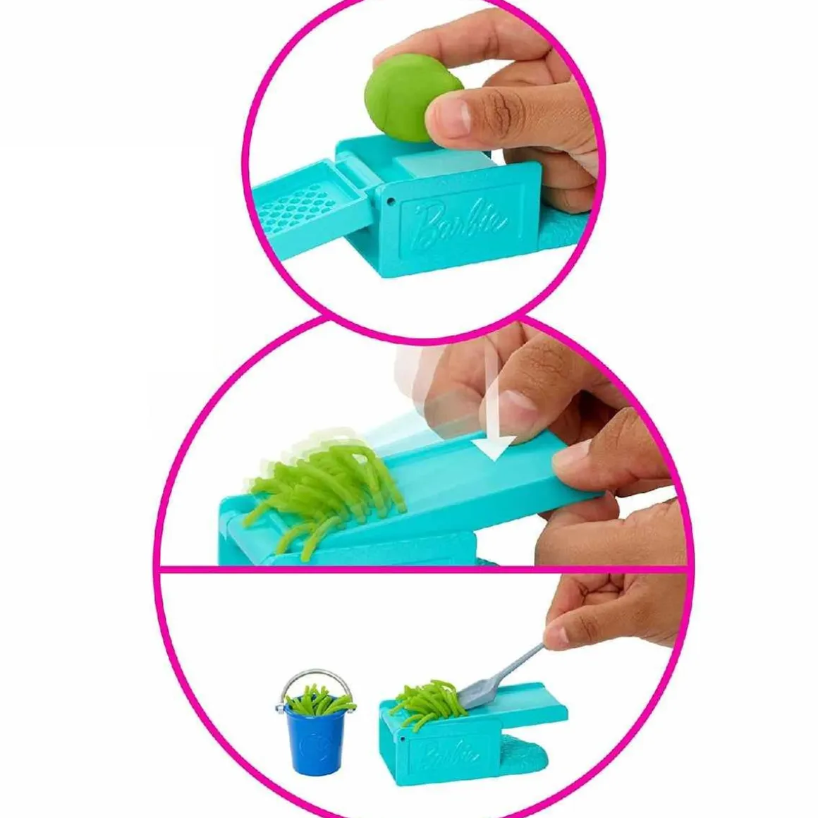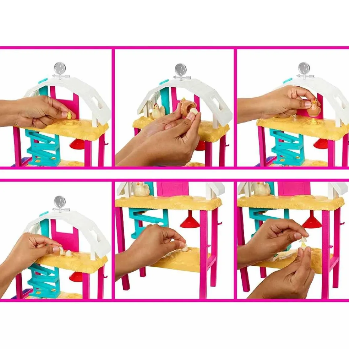 Este conjunto de juego incluye una muñeca Barbie, un gallinero, plastilina de 2 colores, un molde de hierba, una pala, un cubo, una cesta, manzanas, un comedero, un ternerito, un conejito, 2 gallinas y 6 pollitos.