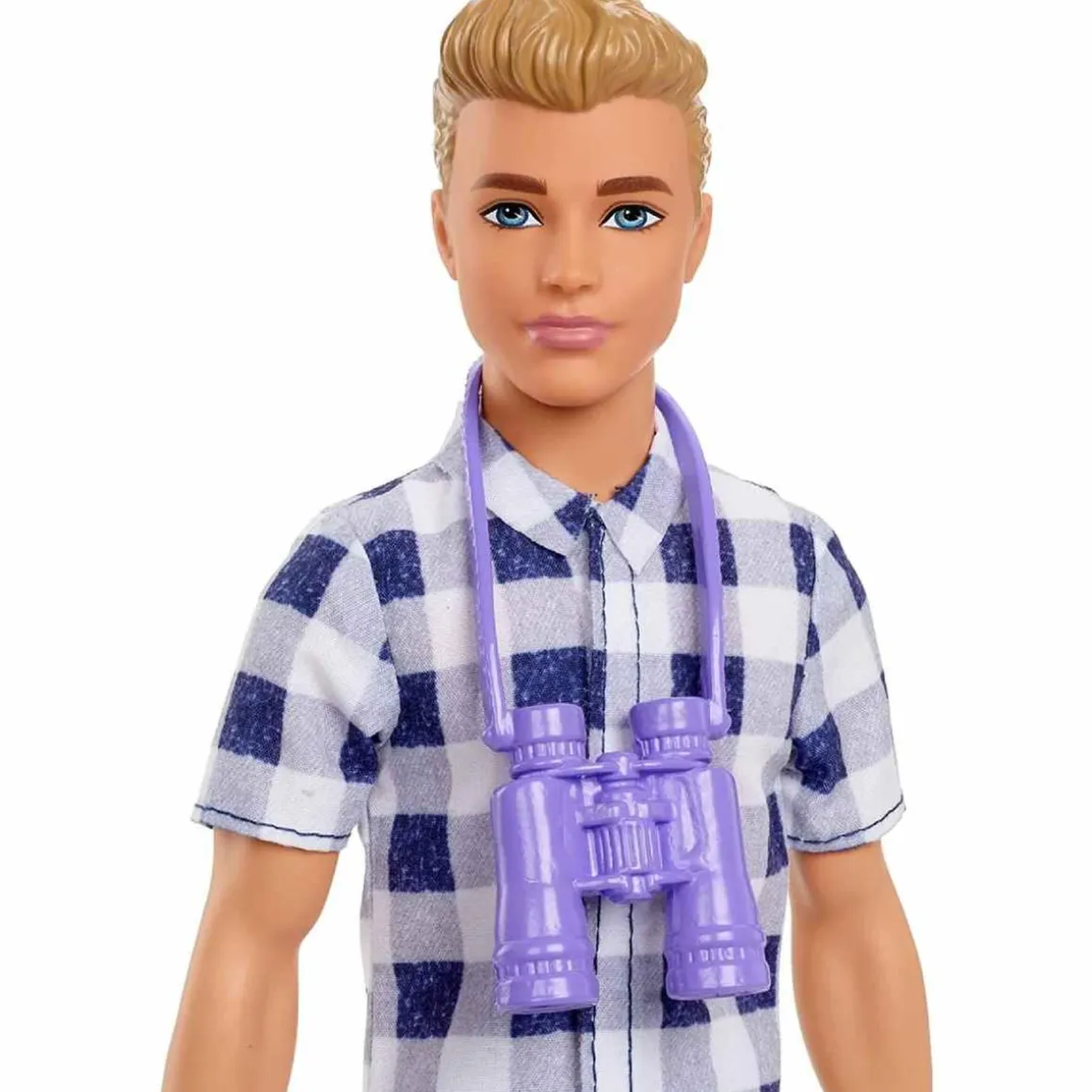 Disfruta de un dia de camping con Ken, que viene vestido con su característico look de campamento, viste una camisa a cuadros abotonada, jeans desgastados y zapatillas blancas informales.