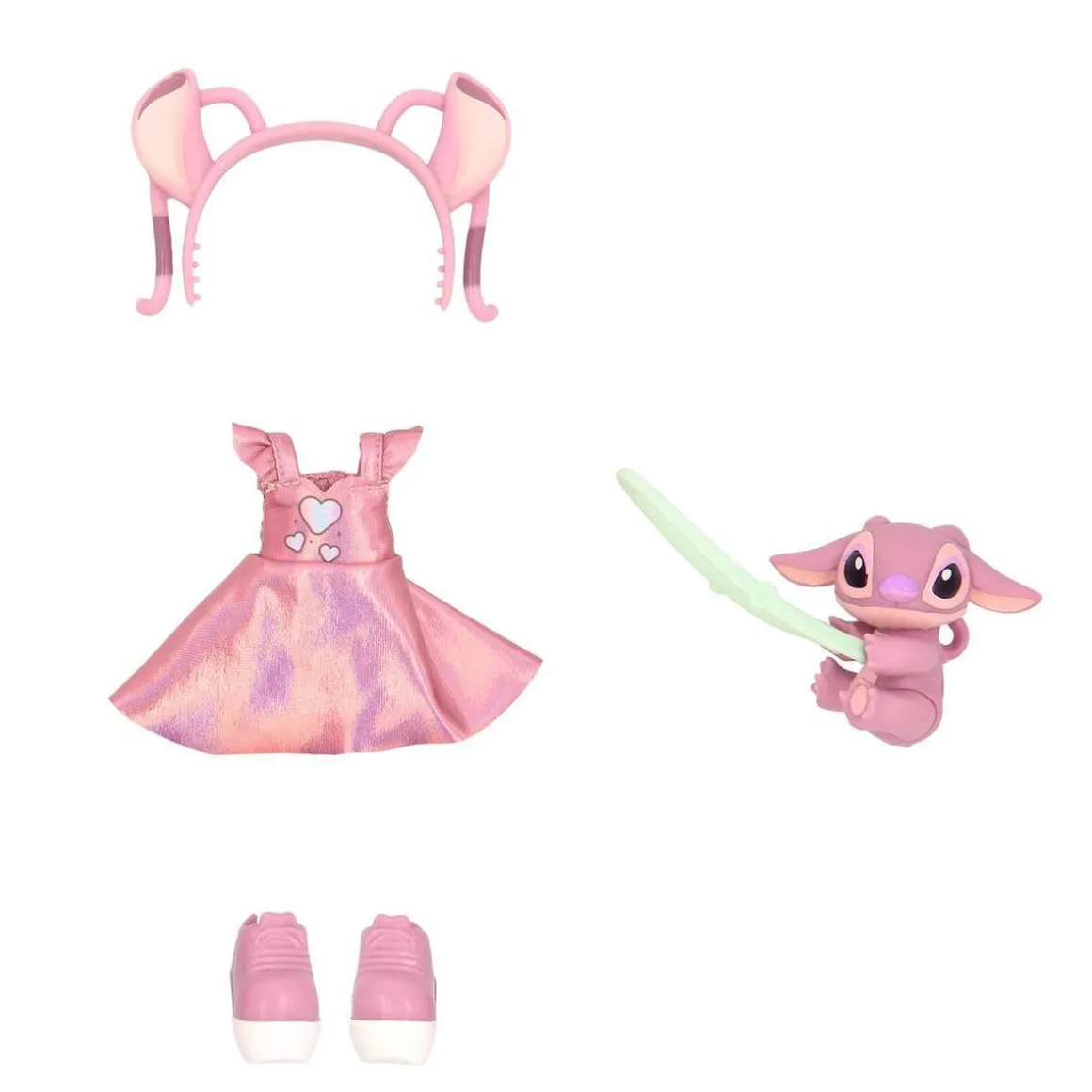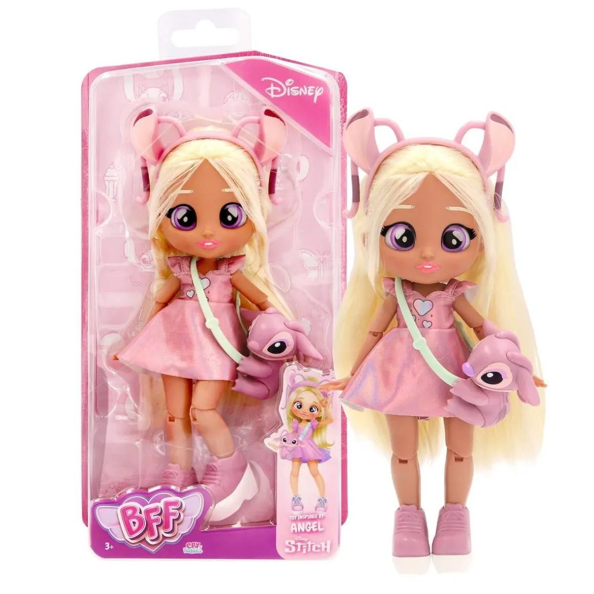 Incluye: 1 muñeca articulada BFF con look inspirado en Angel de Disney Stitch que incluye larga melena rubia, vestido rosa brillante con estampado de corazones, calzado rosa a juego y diadema con orejas de Angel de color rosa a juego y 1 bolso bandolera con forma de Angel.