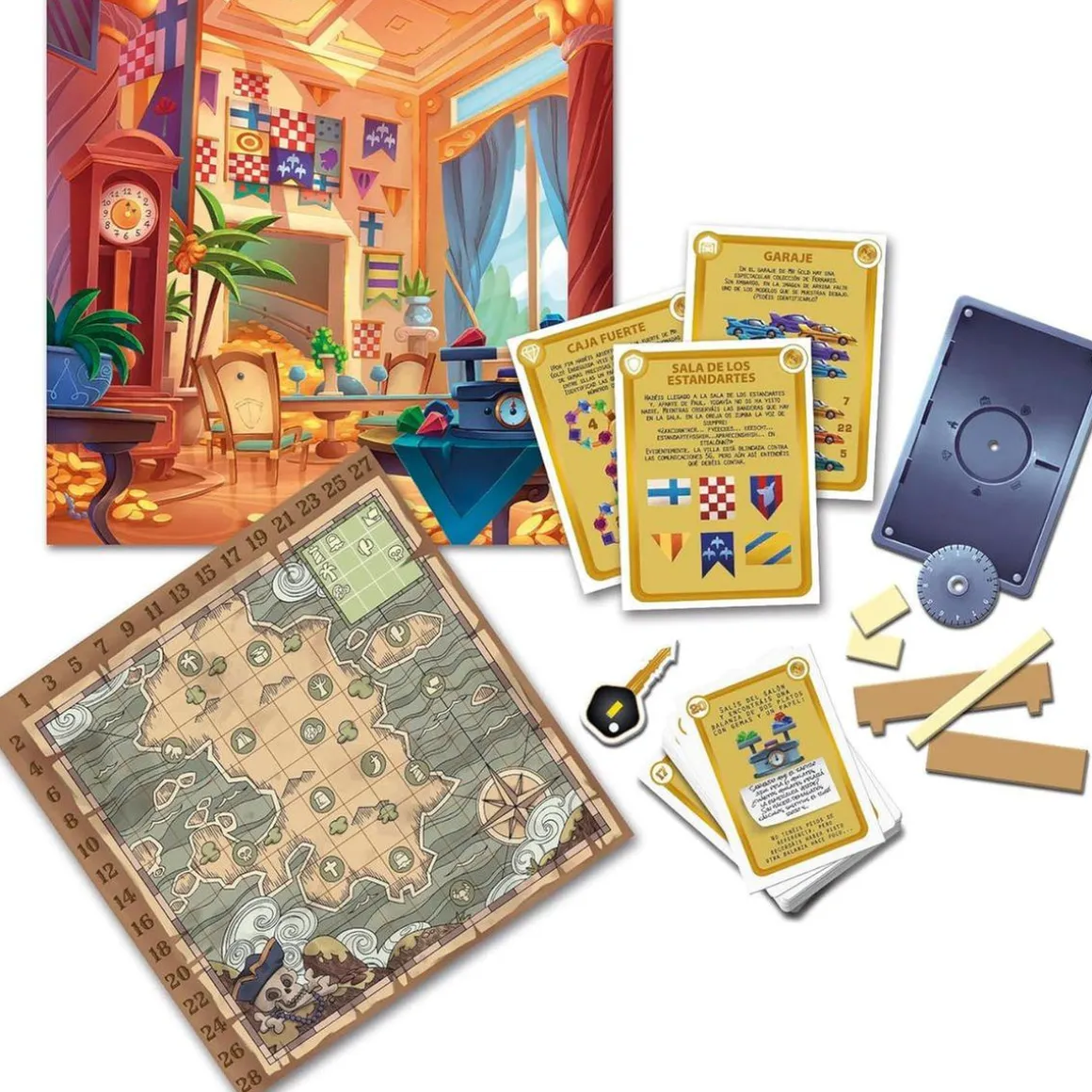 En este juego, cada aventura está asociada a una baraja de cartas con intrigantes acertijos, un tablero que recrea el entorno y objetos misteriosos que ayudarán a los jugadores a avanzar en el juego. Prepárate para vivir increíbles aventuras en la Casa Embrujada, viajar en el famoso Orient Express y resolver los misterios de la mansión de Mister Gold y de la Isla del Tesoro.