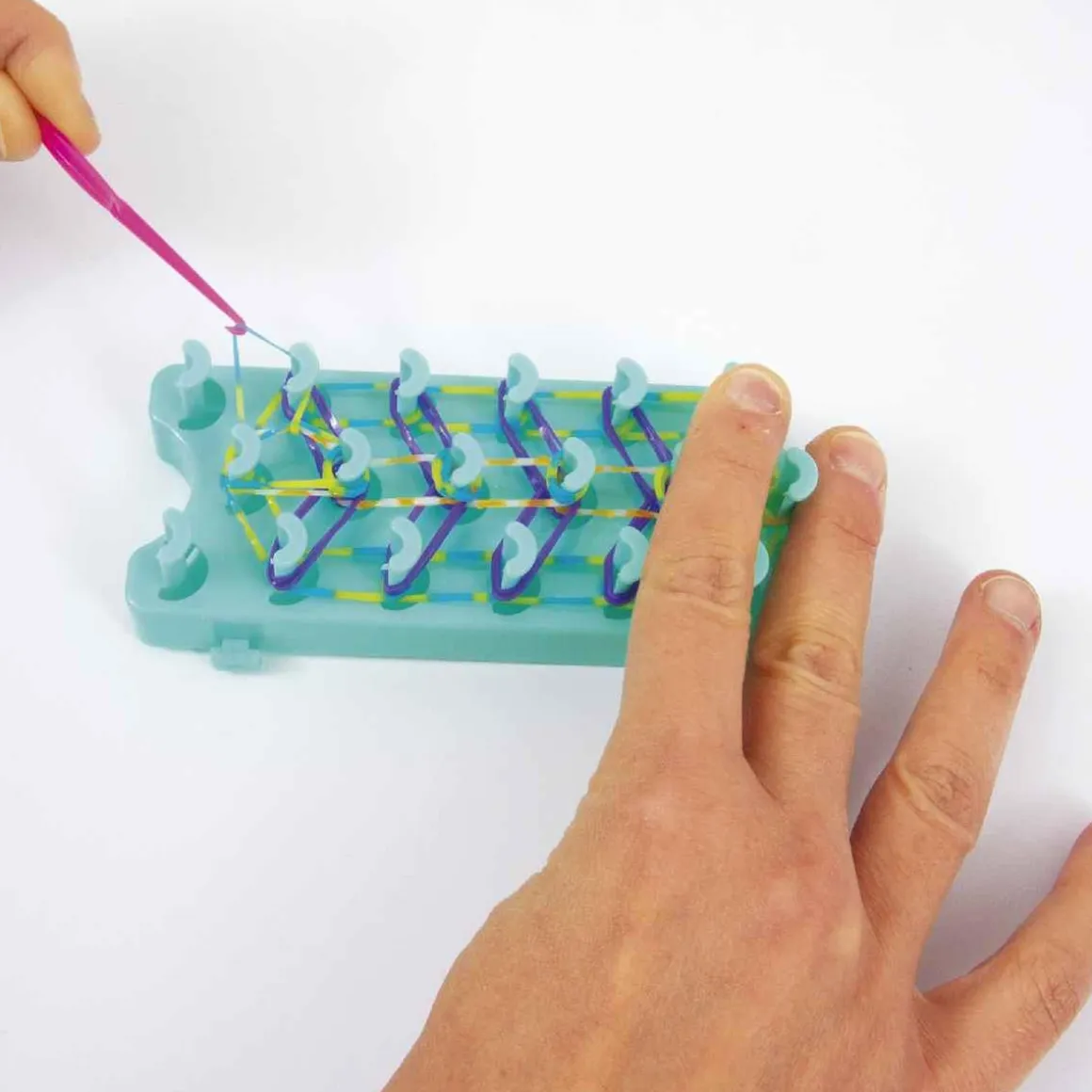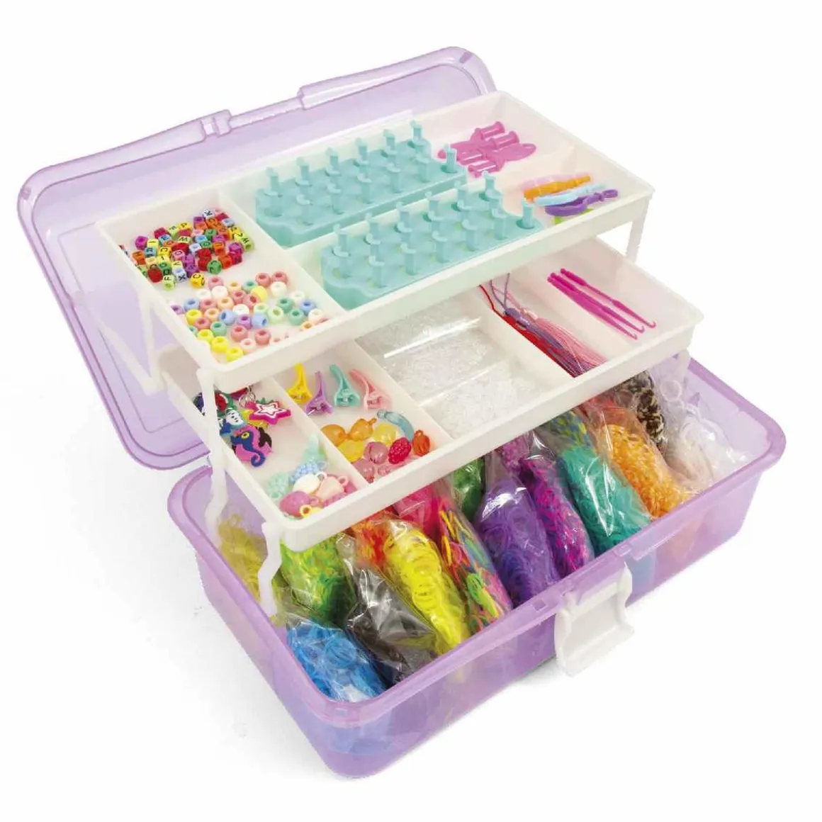 Incluye más de 8.000 bandas elásticas de colores, un práctico manual ilustrado paso a paso y todas las herramientas necesarias en una práctica caja con estantes para llevar tu kit a cualquier parte.