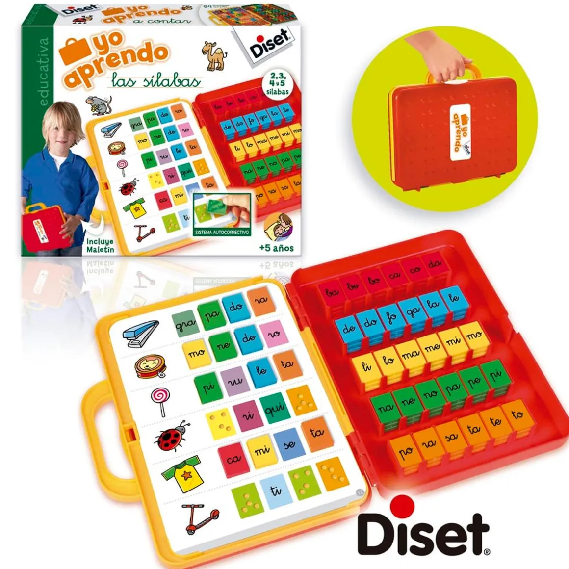 Yo aprendo las sílabas es el juego educativo de Diset auto correctivo: Las sílabas solo encajan en la casilla correcta de su color. Aprende tú solo a separar por sílabas. El color de la casilla ayuda al niño a reconocer la sílaba que tiene que poner. Cómodo maletín para transportar, guardar en el compartimento especial las 15 láminas y jugar con él. Una vez guardadas en su sitio, las letras no se caen.