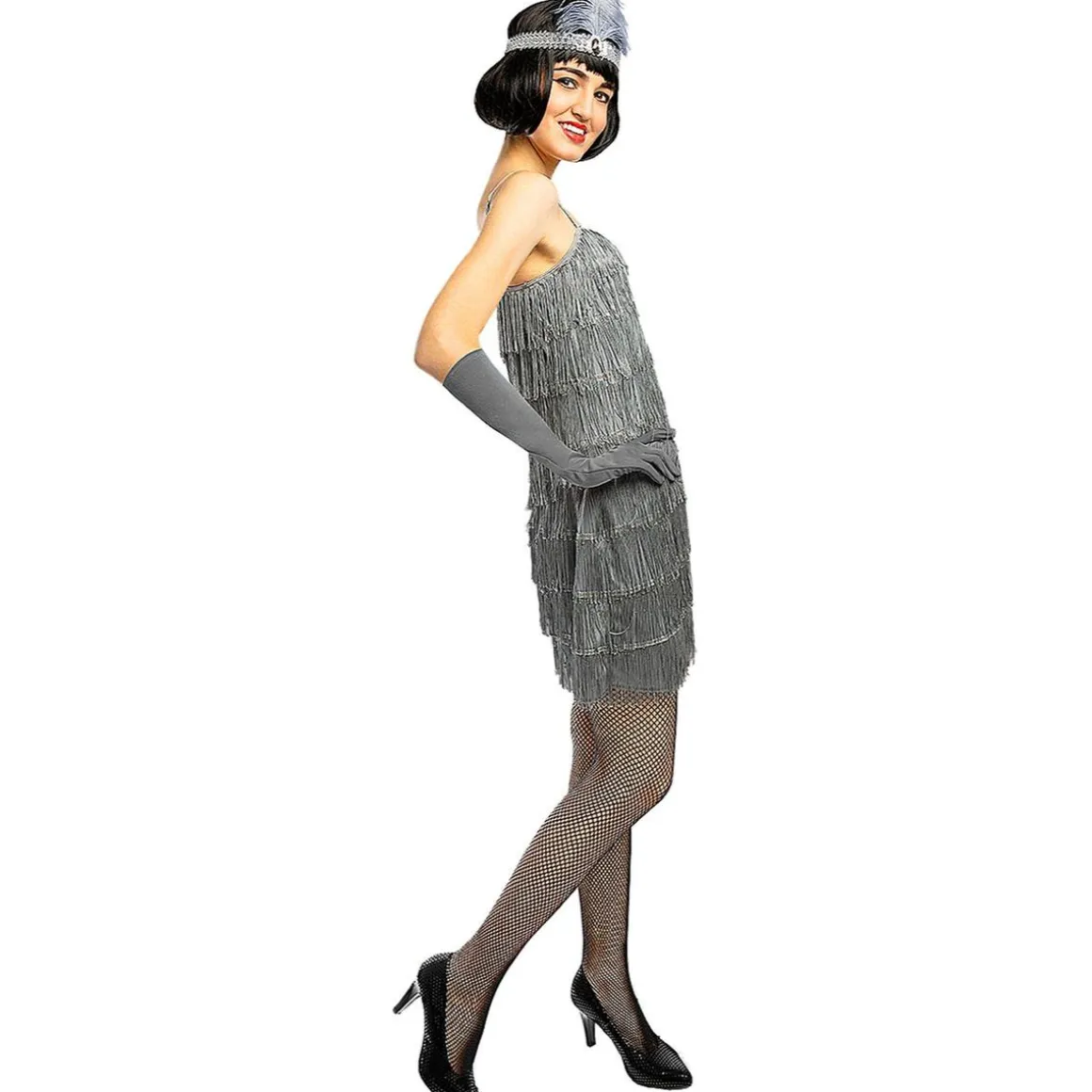 El conjunto incluye un vestido con flecos que se mueven al ritmo de la música, unos guantes largos que añaden un toque de glamour y una cinta decorativa para la cabeza que completa el estilo de la época.