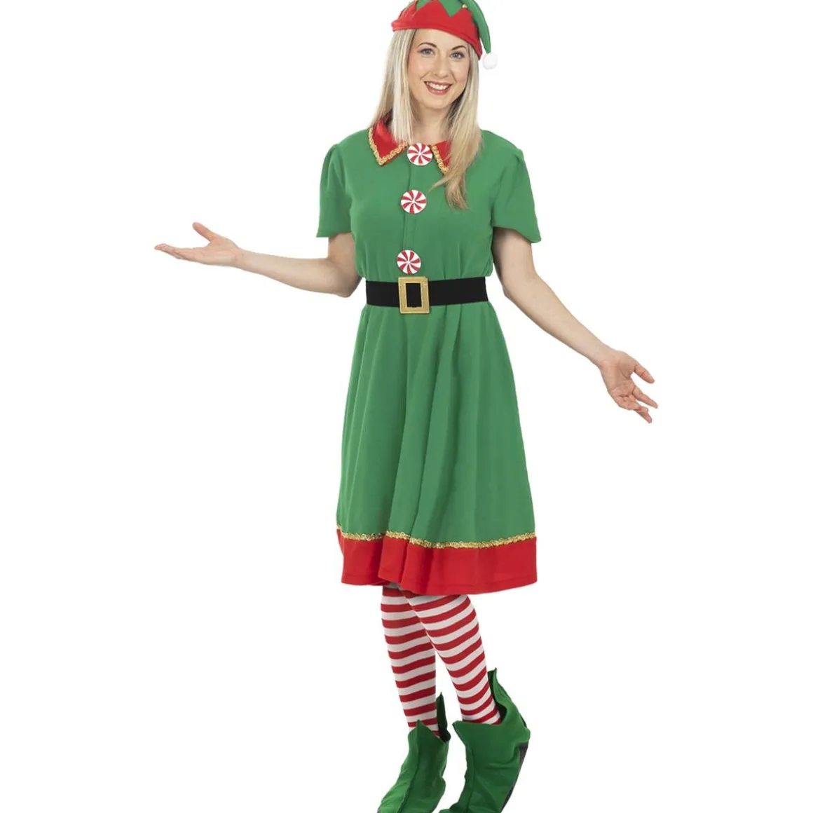 Este disfraz de elfa en talla XXL es ideal para acompañar la magia navideña con un look alegre y festivo. Incluye vestido verde con detalles en rojo, cinturón y gorrito, logrando un estilo divertido y original.