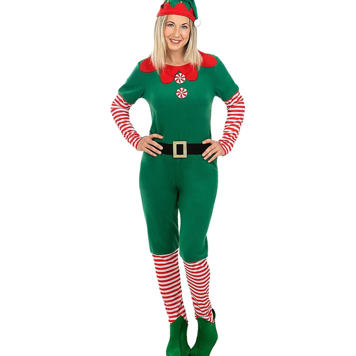Este disfraz de elfa navideña para mujer en talla XXL incluye camiseta, pantalón, cinturón y gorrito, creando un conjunto alegre y original para las fiestas. Su diseño en colores verdes y rojos transmite diversión y el auténtico espíritu navideño.