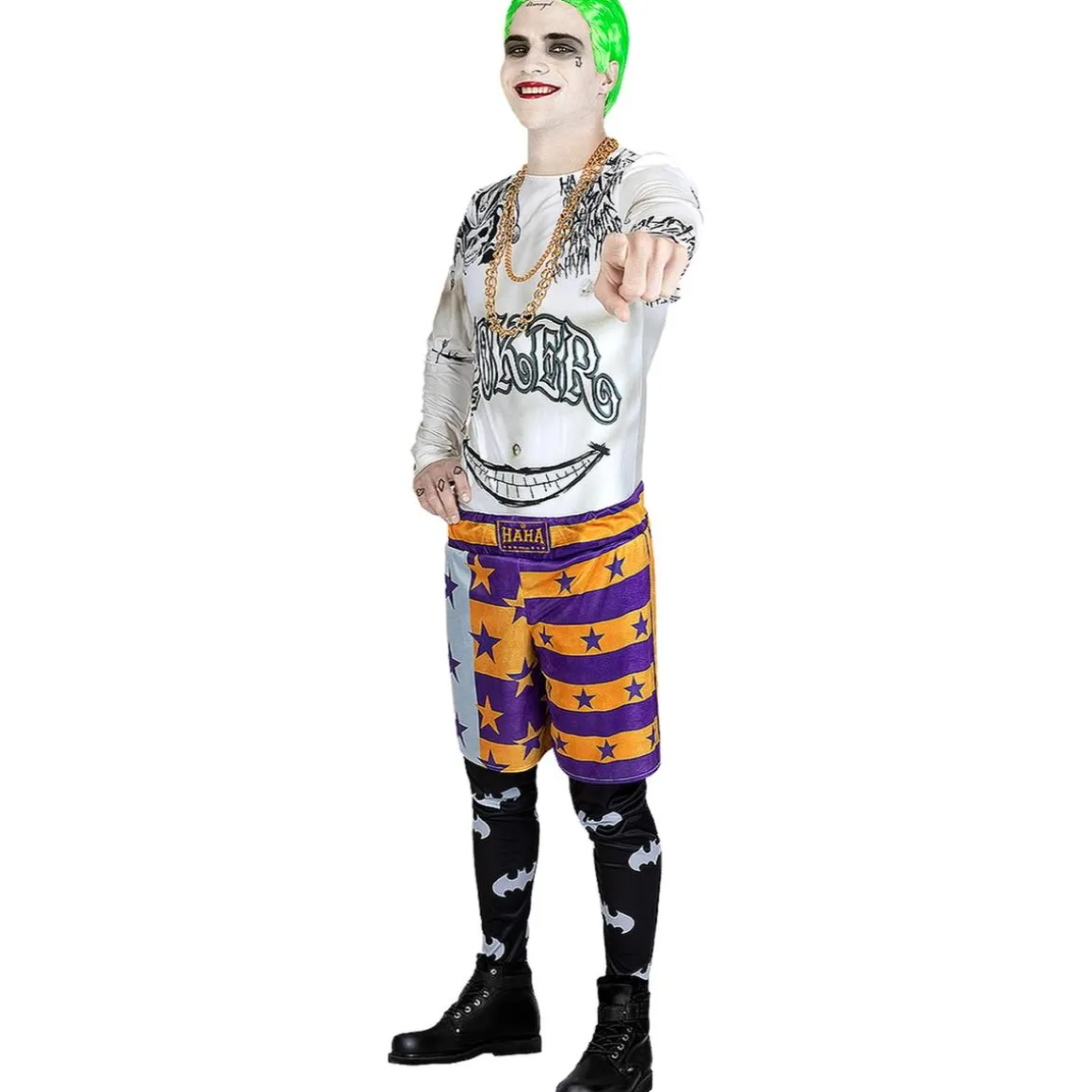 Con este disfraz en talla XL podrás transformarte en el Joker de Escuadrón Suicida. Su camiseta impresa, leggins y pantalón corto reproducen su estilo caótico, acompañado por la gabardina y cadenas que completan el look urbano y peligroso.