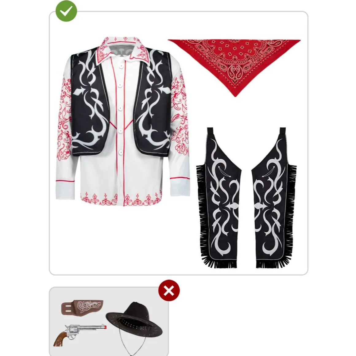 Adéntrate en el salvaje oeste con este auténtico disfraz de vaquero para adulto. El conjunto incluye una camisa con chaleco incorporado, un pañuelo para el cuello y perneras que evocan el estilo clásico de los vaqueros del viejo oeste. Fabricado en 100% poliéster de alta calidad, este disfraz asegura comodidad y resistencia, permitiéndote disfrutar de fiestas temáticas, carnavales o eventos de cosplay con total confianza. Completa tu look con un sombrero de vaquero y unas botas para convertirte en el forajido más elegante de la fiesta.