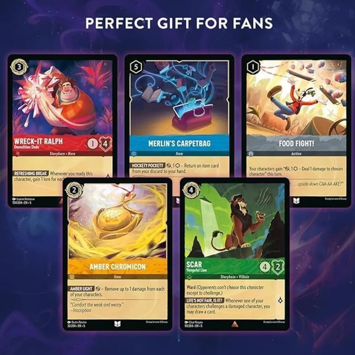 El pack incluye cartas de alta calidad, fichas de juego y un reglamento, garantizando horas de diversión continua. Además, cuenta con un paquete de refuerzo que incluye cartas aleatorias como un atractivo extra. Este starter deck no solo es una magnífica iniciación en el mundo de Lorcana, sino que también potencia el interés por coleccionar y aprender estrategias de juego.