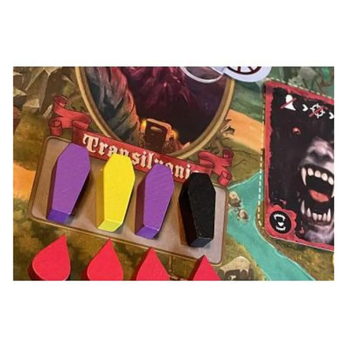 Contiene: 1 tablero de mapa, 1 tablero de eventos, 1 tablero de Drácula, 4 tableros de carruaje, 57 cartas de viajeros, 63 cartas de peligros, 18 cartas de eventos, 16 ataúdes de madera, 60 tokens de sangre de madera, 24 tokens de hombre lobo, 50 tokens de moneda, 4 tokens de carruaje y las reglas.
