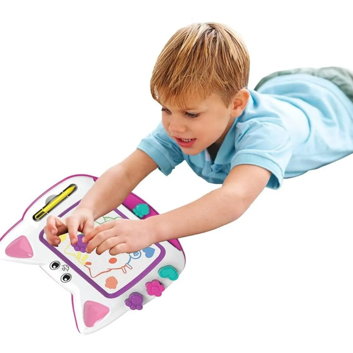 Esta pizarra magnética viene con lápiz magnético y tres sellos únicos de diferentes formas – flor, corazón y huella de gato – para enriquecer el tiempo de dibujo de tus hijos y permitirles personalizar sus creaciones al máximo.