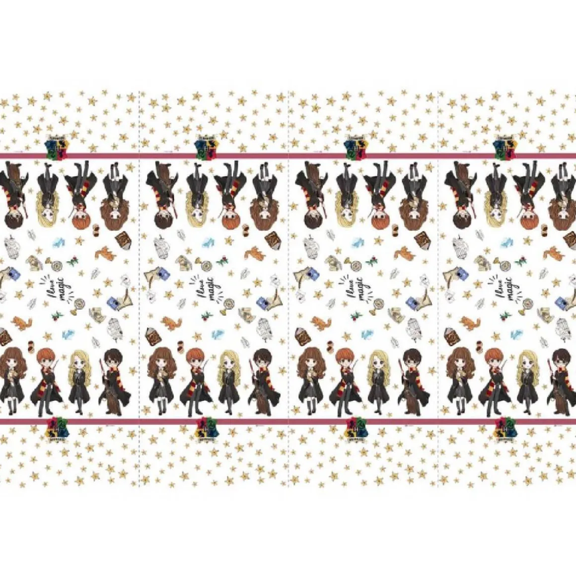 El mantel está estampado con Hermione, Ron, Harry y Luna, además de un montón de objetos de la saga que cualquier seguidor de la magia reconocerá.