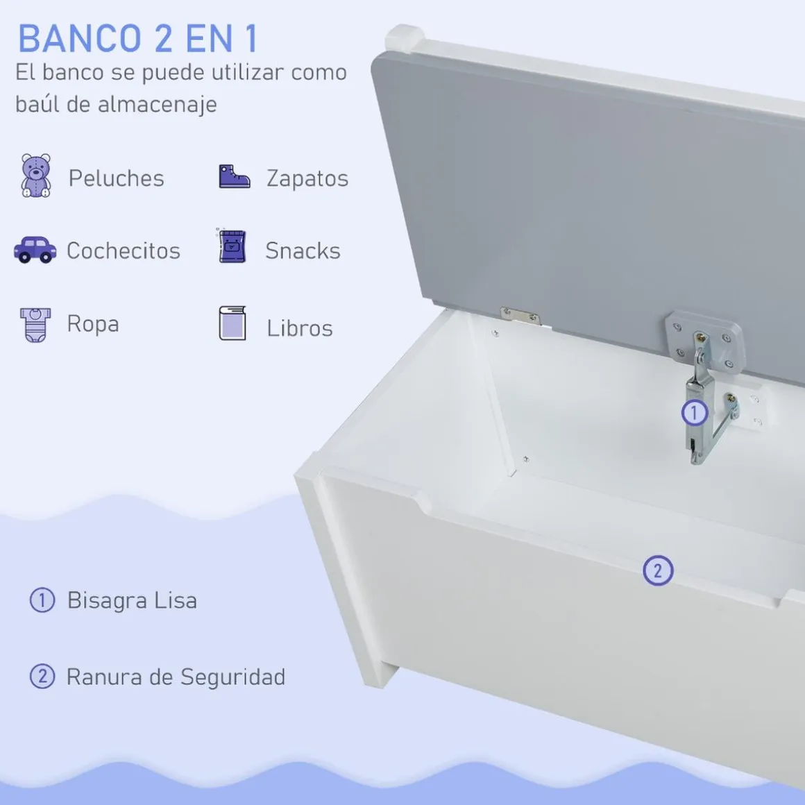 - Amplio espacio de almacenamiento bajo el asiento del banco
