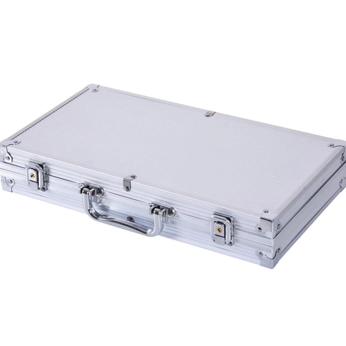 El diseño de la caja es muy elegante, con el exterior revestido de aluminio resistente, con dos cerraduras para evitar que se pierdan las fichas y el interior forrado con un tapizado suave que mantiene las fichas en orden y limpias.