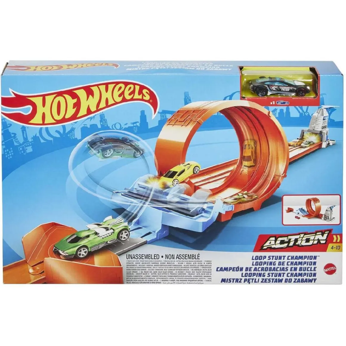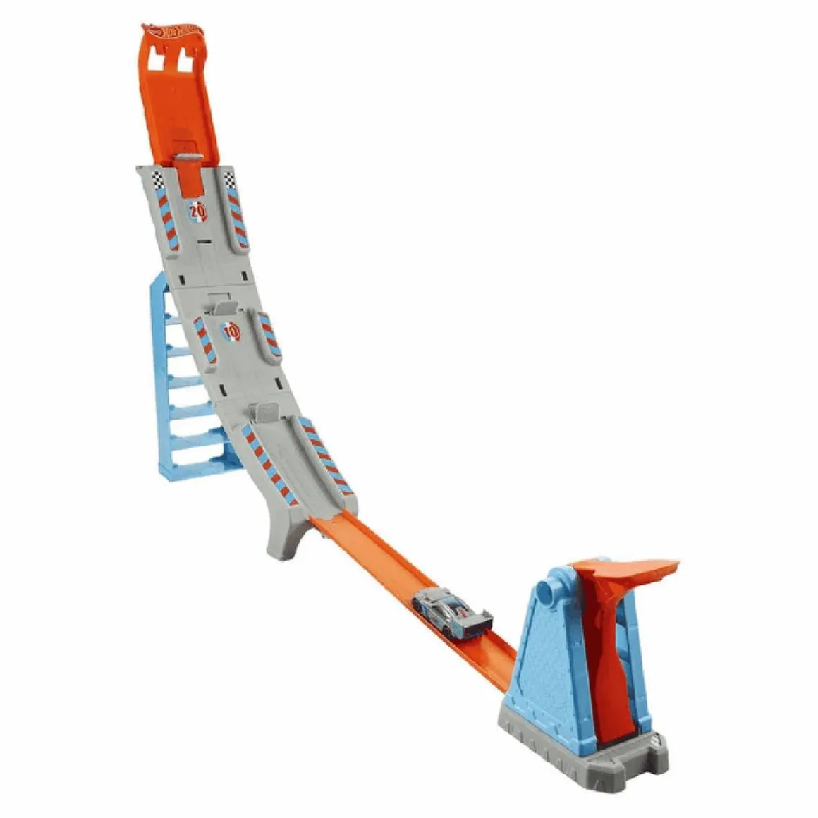 El set incluye varias secciones de pista, rampas, curvas y un lanzador de coches que permite iniciar la carrera a máxima velocidad. Gracias a su diseño modular, es posible combinarlo con otros sets Hot Wheels para ampliar el circuito y crear escenarios de competición aún más emocionantes.