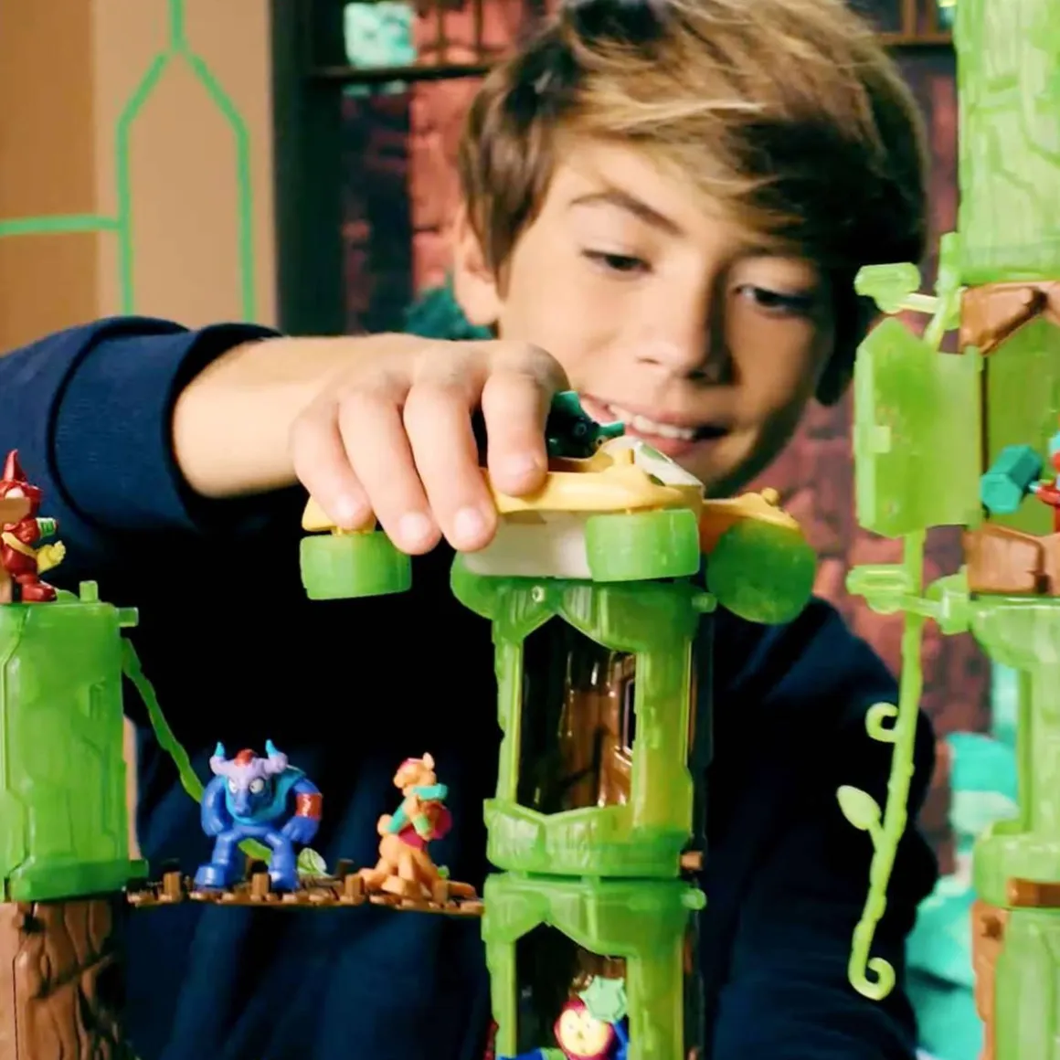 Incluye 7 figuras (una especial garantizada) y sus 7 cartas, 2 troncos, 2 accesorios conectables y un folleto.