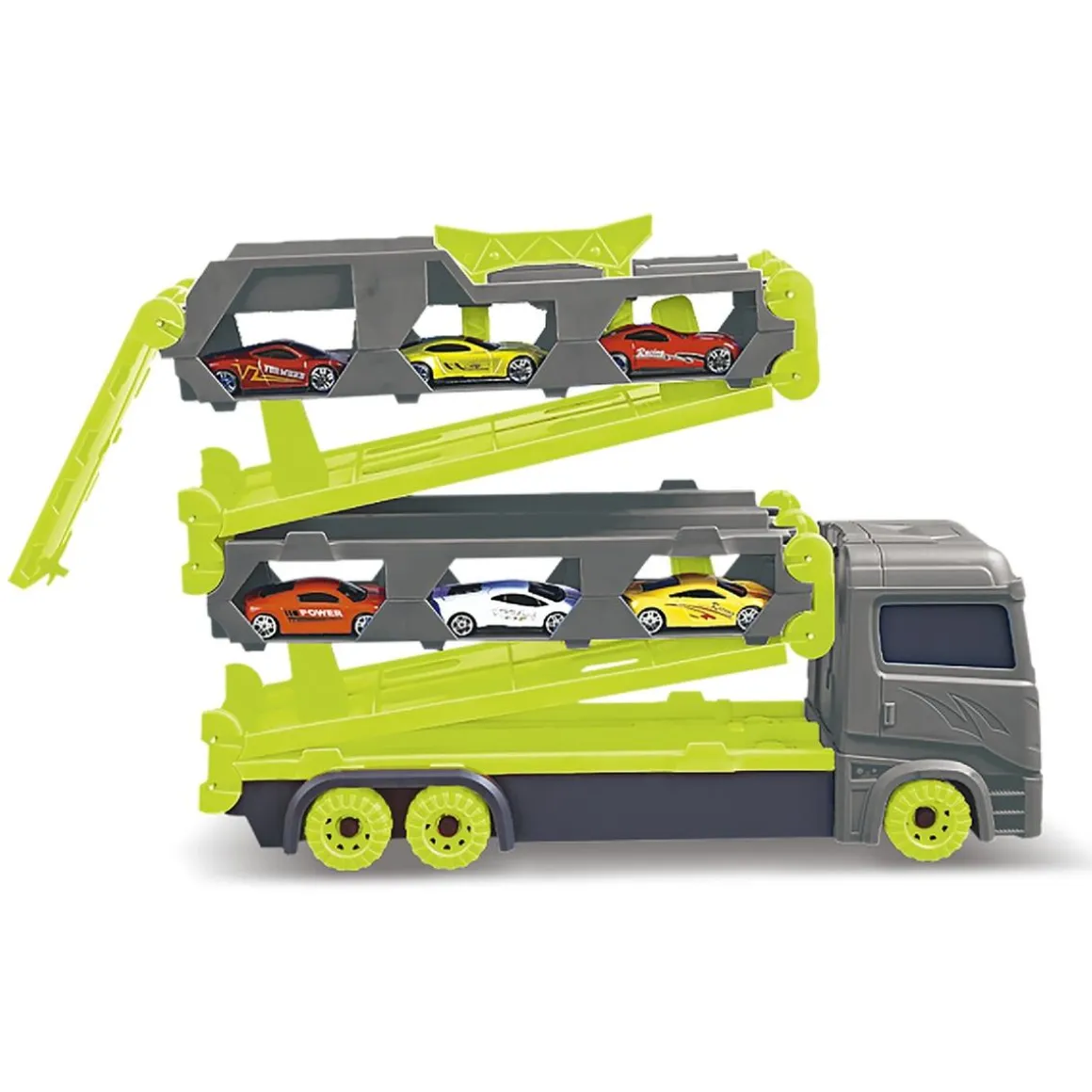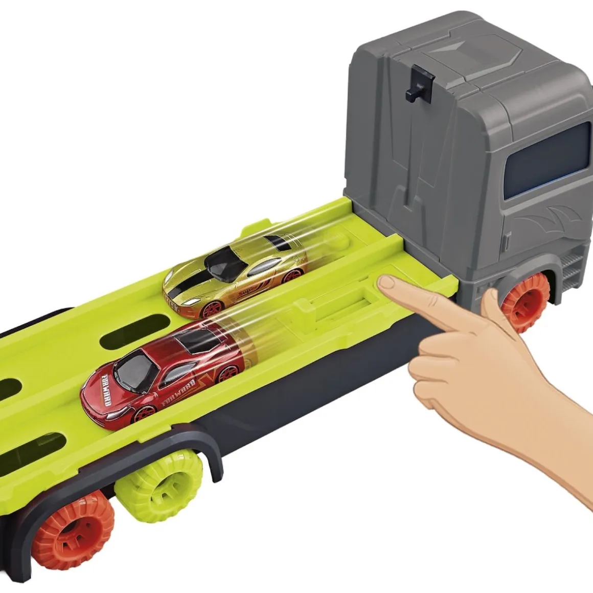 El camión tiene espacio para guardar varios coches en su interior (¡incluye 2 vehículos de metal!) y cuenta con una práctica asa para transportarlo fácilmente donde quieras. Los pequeños pilotos podrán cargar, conducir y desplegar su pista en cualquier lugar, creando infinitas aventuras de motor.