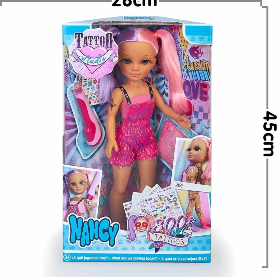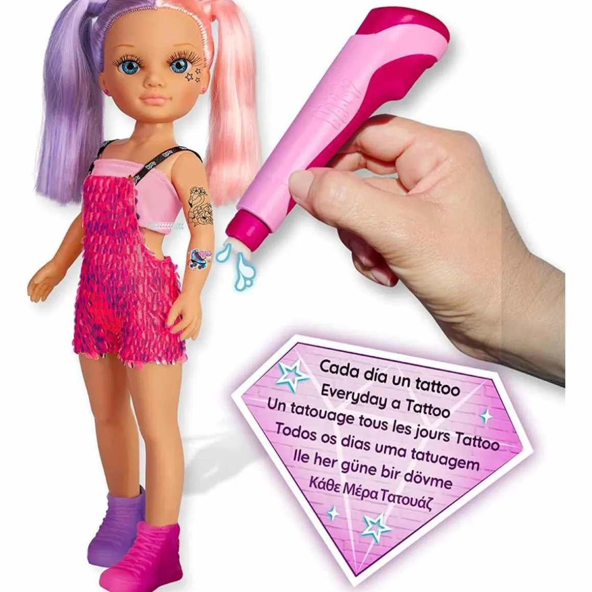 Nancy – Cada día un Tattoo, una muñeca Nancy súper moderna que siempre sigue las tendencias y va a la moda, por eso ha aprendido a hacer tatuajes y ha creado su propio estudio con una maquina de tatuar, para que ella y todas sus amigas puedan ir siempre a la última.