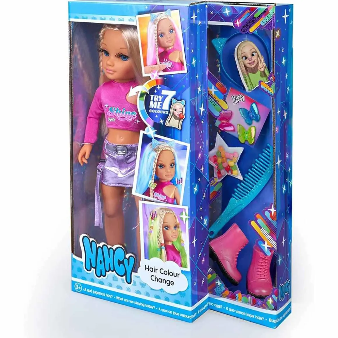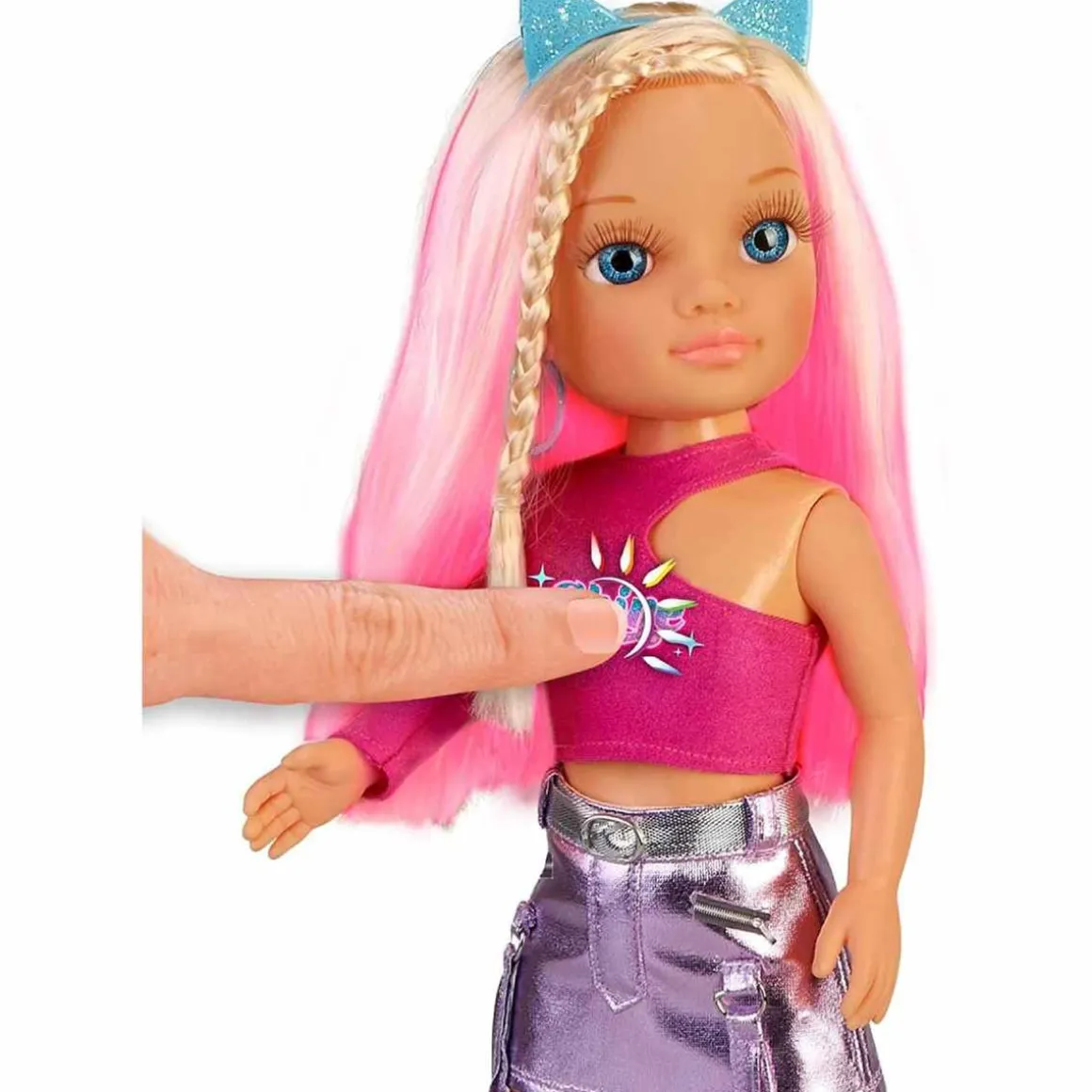 Nancy – Hair Colour Challenge, una muñeca Nancy súper moderna que siempre sigue las tendencias y va a la moda, por eso ahora se cambia el color de su melena larga y lleva una diadema con orejas de gato.