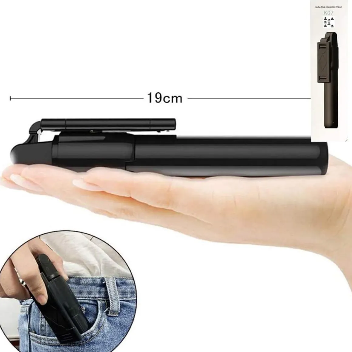 Compacto y Ligero. El diseño de palo de selfie puede estirarse hasta 70 cm cuando está completamente extendido y puede plegarse hasta 19 cm al mismo tiempo. Es fácil de transportar, fácil de guardar en un bolsillo o bolsa, y ocupa poco espacio. El cuerpo principal del palo selfie está hecho de material ABS ligero y duradero, y hay un diseño de esponja en el soporte para proteger el teléfono de arañazos y proporcionar un uso como bolsa de almacenamiento.