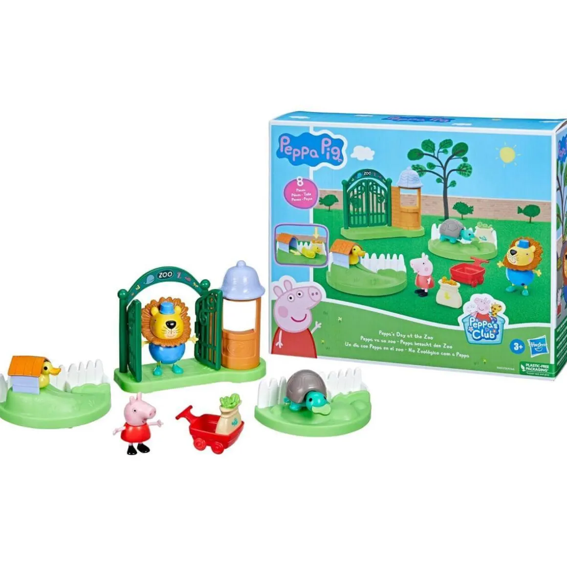 Incluye figuras de 7,5 cm, aproximadamente, de los populares personajes Peppa Pig, Mr. Lion y el cuidador del zoológico. Las figuras se pueden combinar con los seis accesorios.