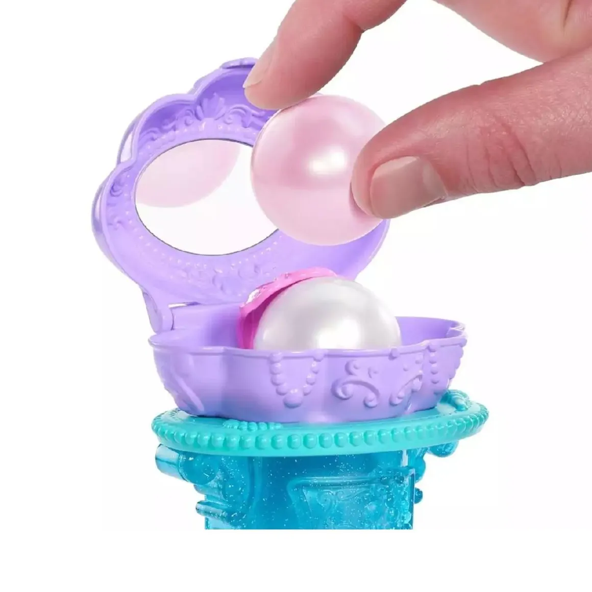 - Tocador mágico con perlas sorpresa: El tocador incluye cinco «perlas», cada una con un accesorio sorpresa en su interior. Al abrir la parte superior, aparece una perla que revela un tesoro oculto; al retirarla, otra perla ocupa su lugar, permitiendo repetir el juego una y otra vez.