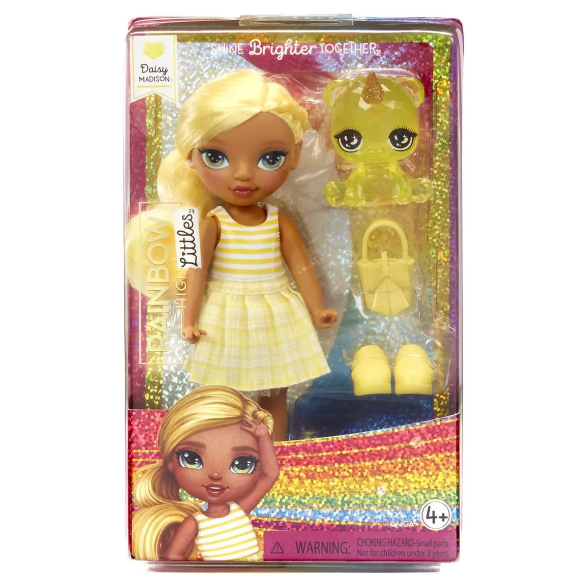 Descubre la magia de las Rainbow High Littles con nuestra encantadora muñeca Daisy amarillo, la hermana pequeña de Sunny Madison. Daisy brilla con su propio estilo único, vistiendo un adorable vestido amarillo con una falda de cuadros suaves y un top con rayas moldeadas. Sus elegantes zapatos y bolso amarillos a juego completan su look, permitiendo que los pequeños imaginen miles de aventuras creativas.