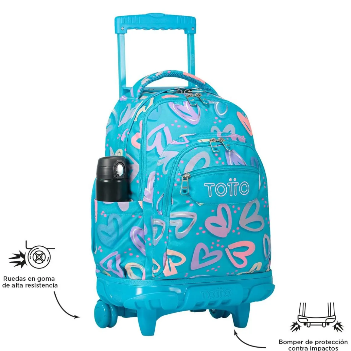 Totto – Mochila escolar con ruedas corazones pintados Renglones, una mochila fabricada con materiales muy resistentes de la colección Renglones.