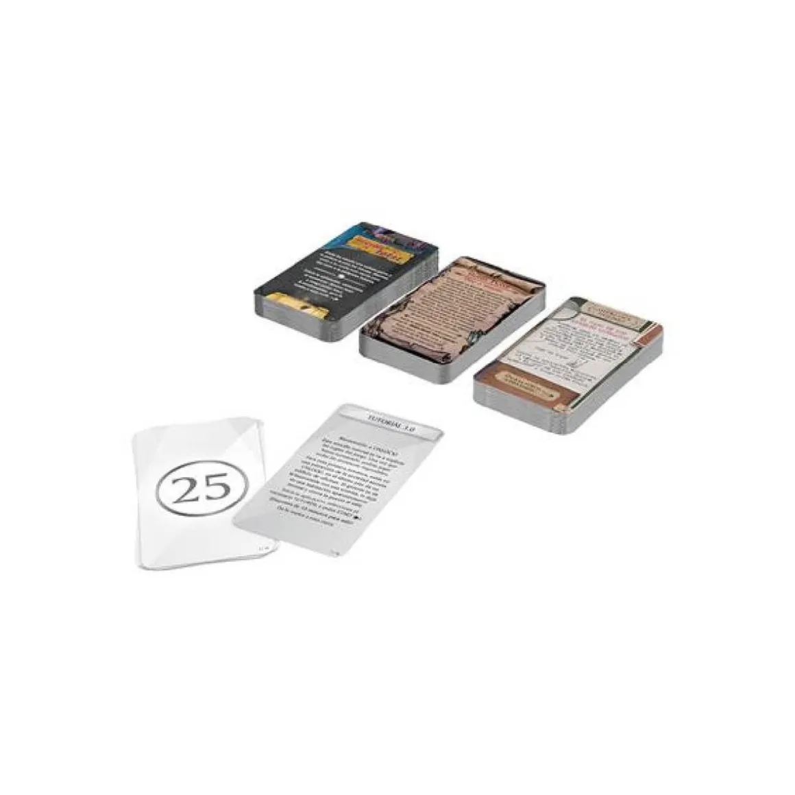Incluye: 1 reglamento, tutorial de 10 cartas, 3 aventuras (180 cartas), 1 carta de lupa, 2 posters, 1 librito de soluciones.