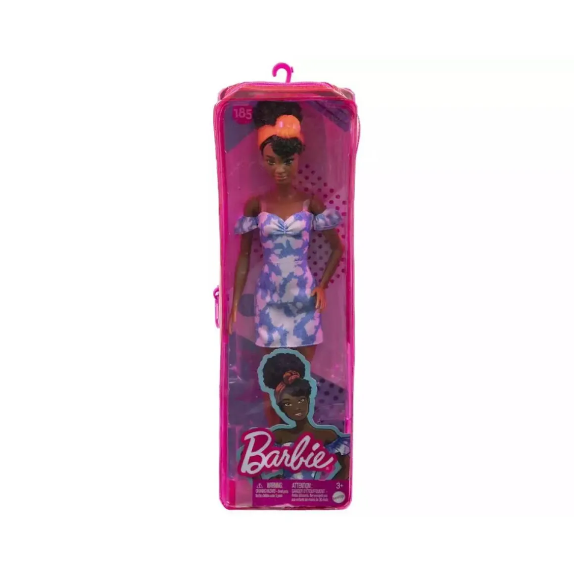 Incluye: 1 estuche de color rosa con cierre de cremallera para la muñeca y 1 muñeca articulada Barbie con pelo moreno rizado, vestido estilo vaquero decolorado azul y blanco, diadema color coral para el pelo y un par de botines blancos.