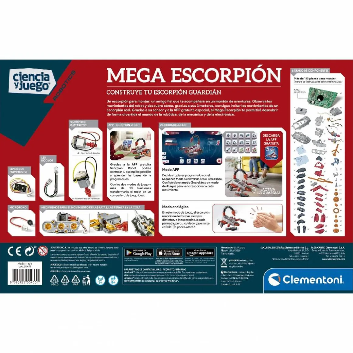 Con sus numerosos componentes, engranajes y motores, el Robot Escorpión es un robot único para montar y controlar a distancia gracias a sus controles de alta frecuencia y la aplicación disponible.