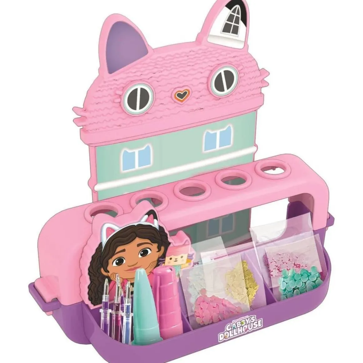 Con este creativo kit de manualidades puedes transformar tu escritorio en un auténtico taller de diseño con estilo. El set incluye 5 bolígrafos listos para personalizar, junto con tintas de colores, decoraciones brillantes, figuras divertidas al estilo de Gabby’s Dollhouse y un montón de pegatinas para darle tu toque personal.