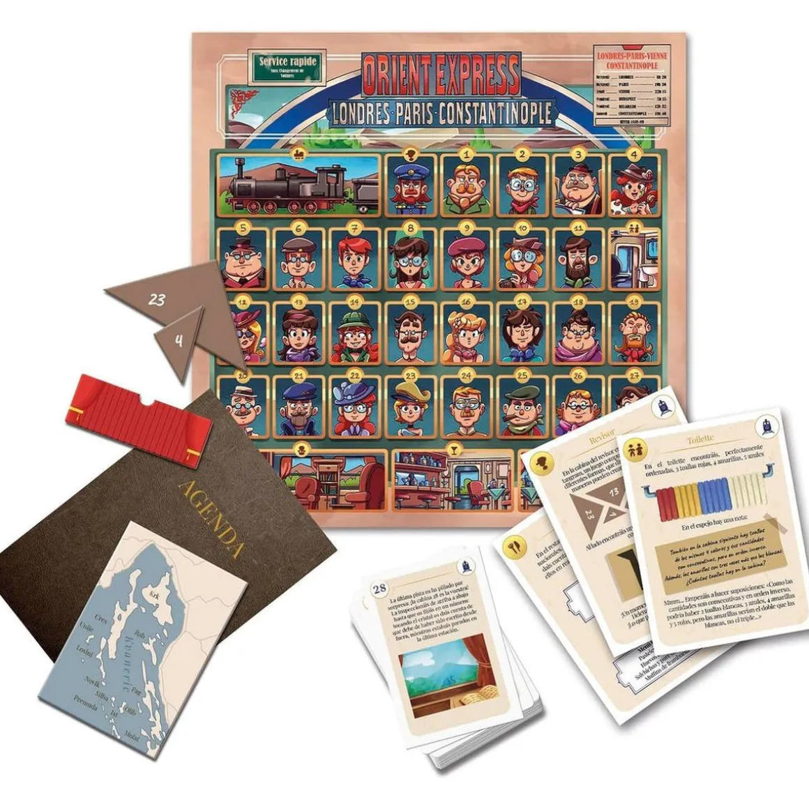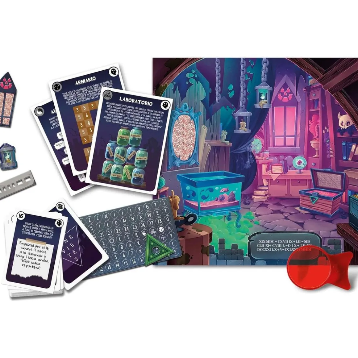 En este juego, cada aventura está asociada a una baraja de cartas con intrigantes acertijos, un tablero que recrea el entorno y objetos misteriosos que ayudarán a los jugadores a avanzar en el juego. Prepárate para vivir increíbles aventuras en la Casa Embrujada, viajar en el famoso Orient Express y resolver los misterios de la mansión de Mister Gold y de la Isla del Tesoro.