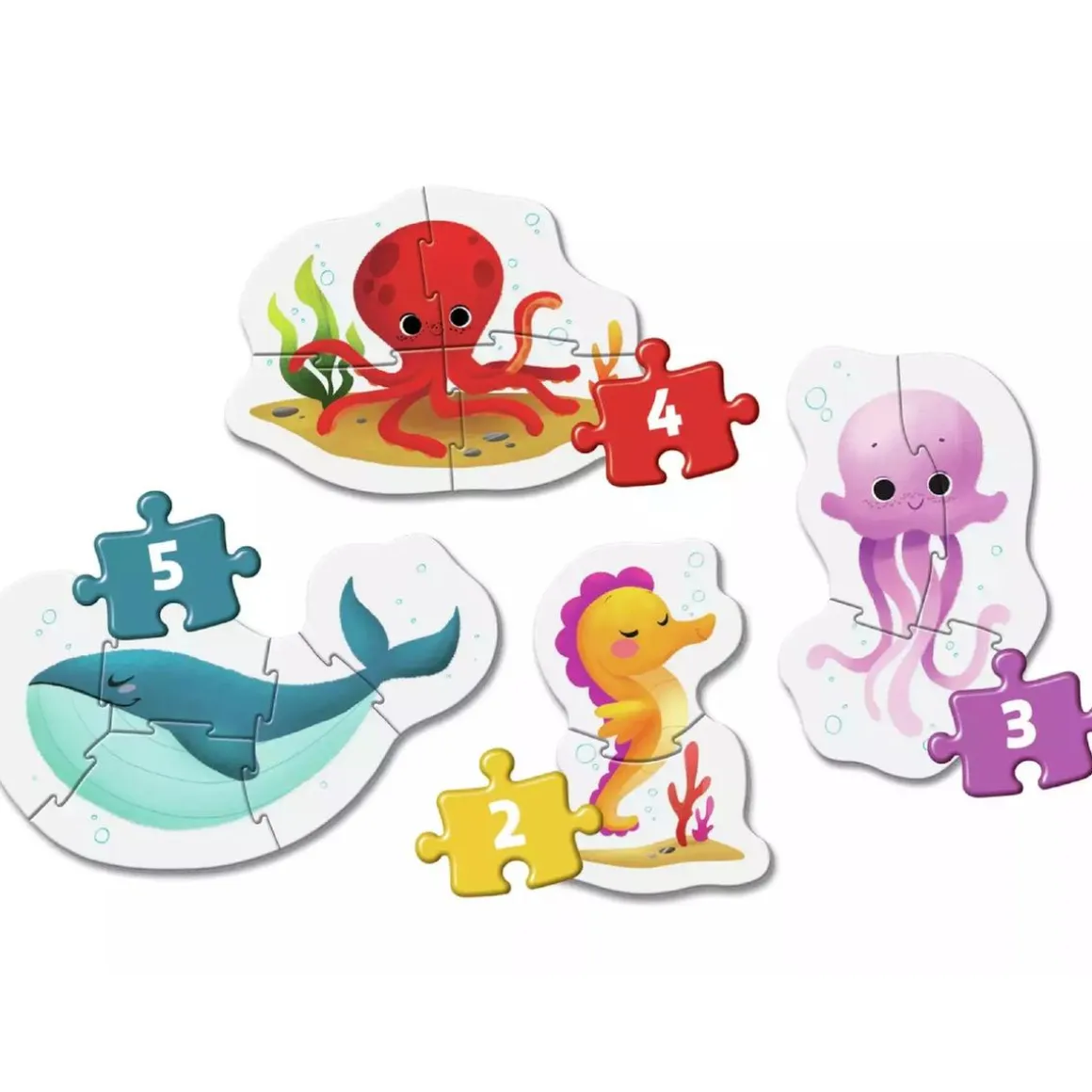 Descubre el mundo del océano con Mis Primeros Puzzles Progresivos Vida Marina de Clementoni. Un set ideal para introducir a los más pequeños en los rompecabezas a través de adorables animales del mar. Incluye puzzles de 2, 3, 4 y 5 piezas con forma de ballena, medusa, pulpo y caballito de mar, diseñados especialmente para las primeras experiencias de juego.