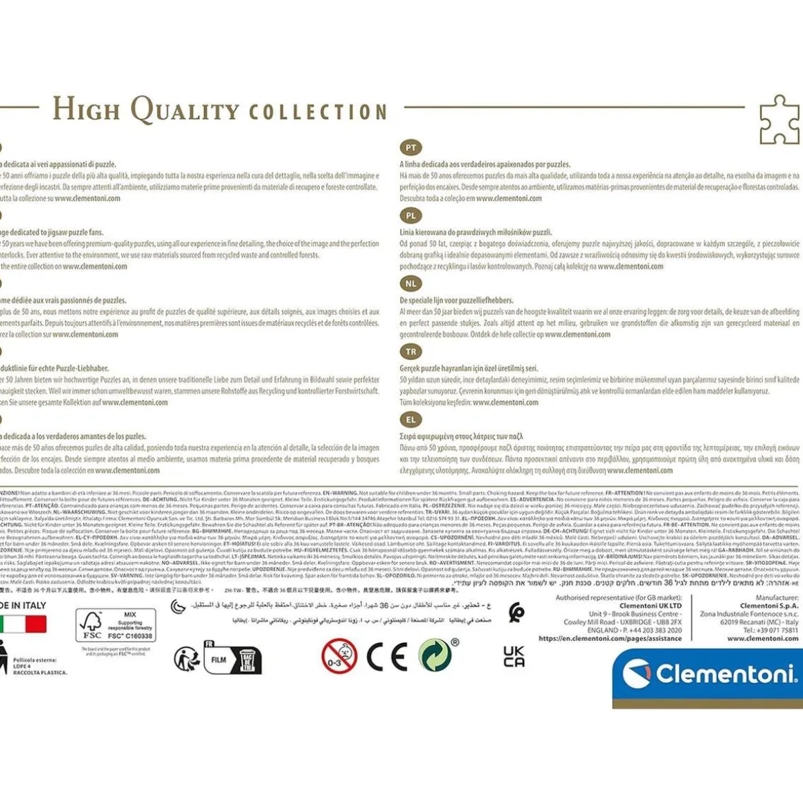 Fiel a la tradición de Clementoni, cada pieza de este rompecabezas está hecha con materiales de alta calidad para garantizar un encaje perfecto. La satisfacción de ver crecer la imagen con cada pieza que colocas es incomparable. Además, una vez montado, este puzzle mide 49 centímetros de ancho y 36 de alto, lo que lo hace ideal para luego enmarcar y colgar en la pared.