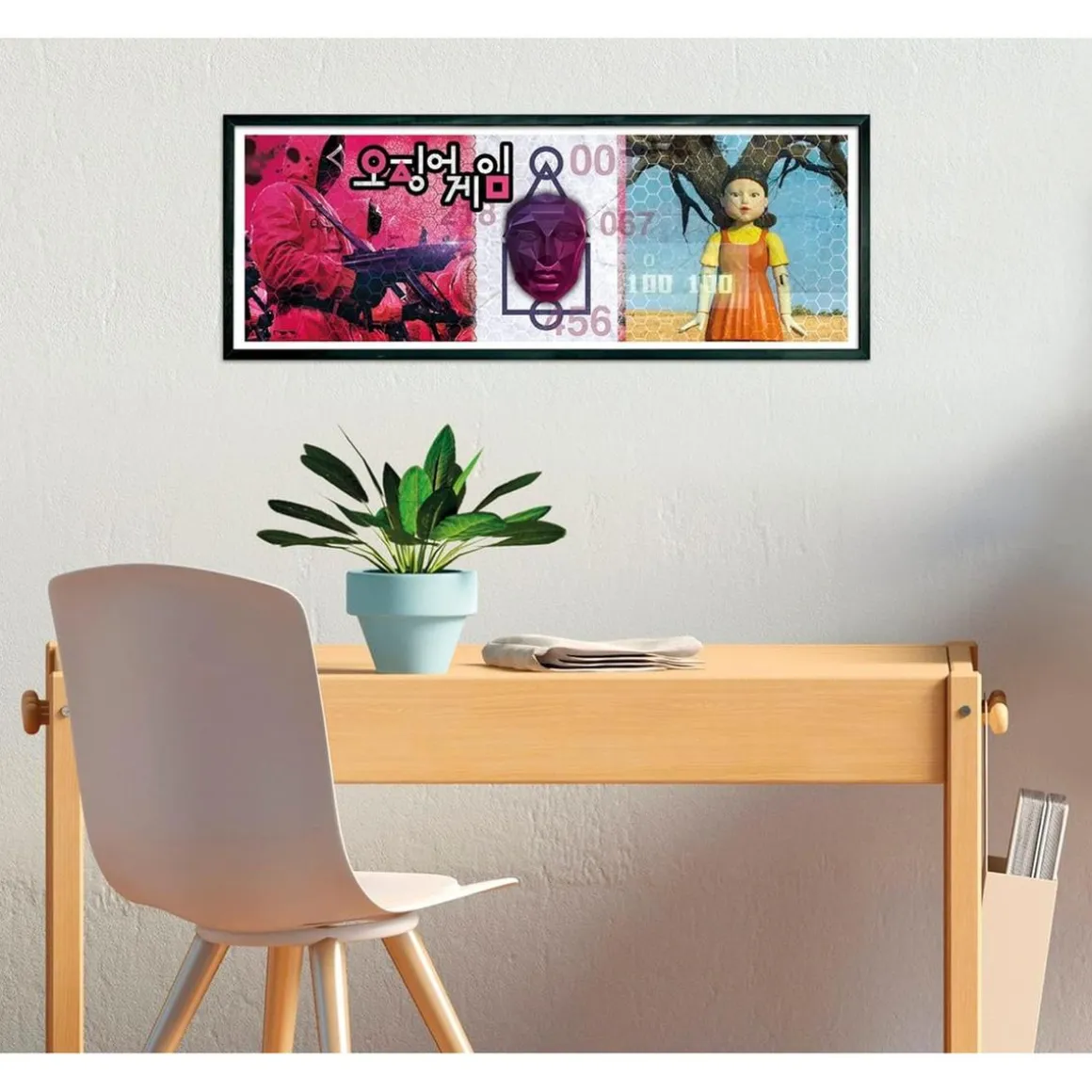 De la mano de Clementoni, este puzzle del juego de calamar se destaca no solo por su alta calidad, sino también por su diseño panorámico. Una vez montado, se transformará en una impresionante imagen de 98 centímetros de ancho y 33 de alto que atraerá todas las miradas. ¡Es el regalo perfecto para todos los seguidores del enigmático mundo del Juego del Calamar!