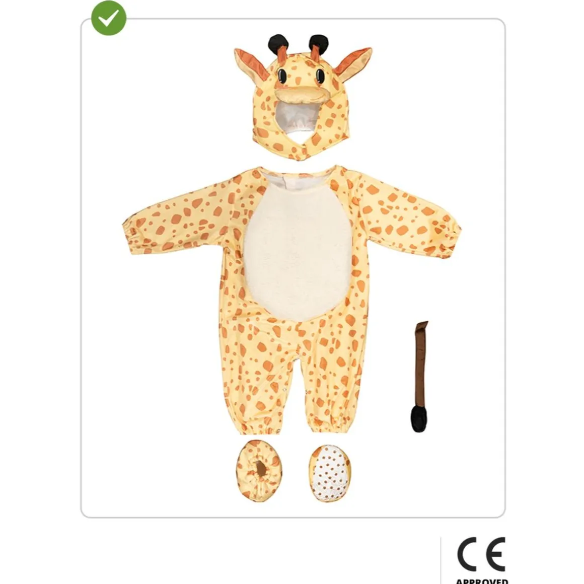 El disfraz de jirafa en talla 12-24 meses convierte a los más pequeños en un simpático animal de la sabana. Incluye un mono con corchetes fácil de poner y quitar, un gorrito con orejas y cuernos, una cola y cubrepies a juego. Confeccionado en tejido suave, este conjunto es cómodo para que el bebé lo lleve durante horas, ideal para Carnaval, sesiones de fotos o fiestas familiares. Su diseño con manchas marrones y detalles cuidados transmite ternura y originalidad. Un disfraz práctico y divertido que hará que los más pequeños sean el centro de atención.