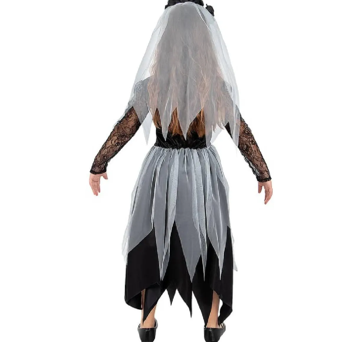 ¡Que suenen las campanas… pero de miedo! Con este disfraz de novia fantasma, tu peque se convertirá en la novia más espeluznante y elegante de Halloween, Carnaval o cualquier fiesta de disfraces.
