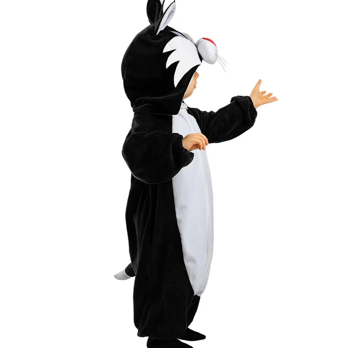 Este disfraz de talla 12-24 meses convierte a los más pequeños en el simpático Silvestre de Looney Tunes. El mono negro con detalles blancos y el gorro con su carita recrean fielmente al travieso gato que siempre persigue al canario Piolín.