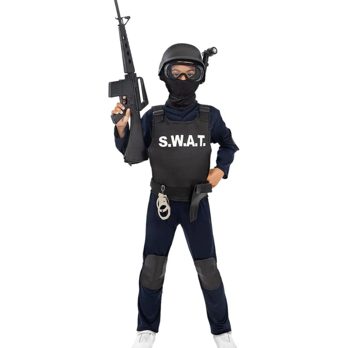 ¡Los pequeños agentes también pueden vivir la emoción con este completo disfraz de SWAT para niño! Incluye un mono, chaleco, coderas, rodilleras, pasamontañas y un cinturón con cartuchera. Confeccionado en un 80% de poliéster, 10% de fieltro y 10% de cuero, este disfraz es resistente y cómodo. Perfecto para juegos de rol o fiestas infantiles, ¡tu pequeño estará listo para la misión!