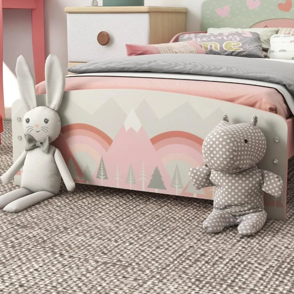 El diseño de esta cama, junto a su color de fondo en color rosa y el bonito estampado en el cabezal y pie de cama de montañas y animales, crea una atmósfera encantadora de ensueño que enamorará a pequeños y grandes
