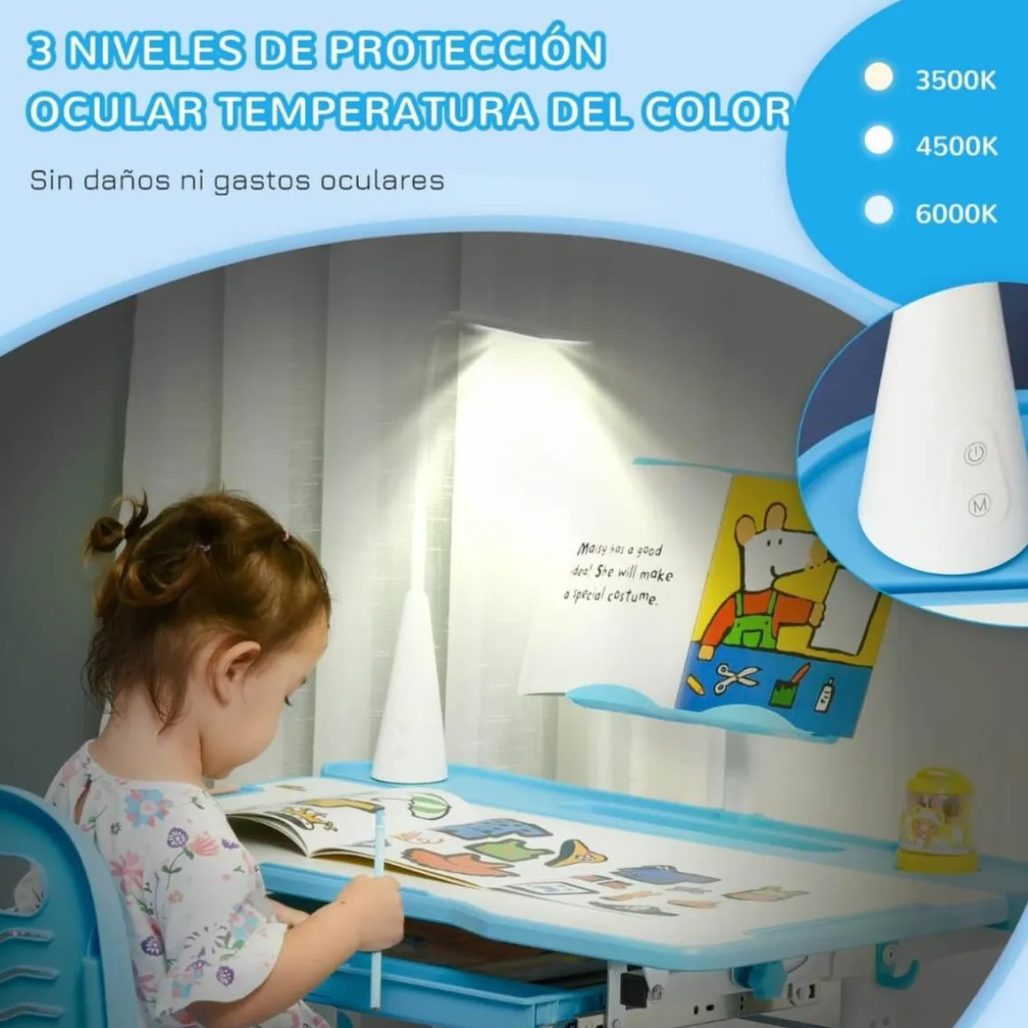 - El escritorio infantil incluye un cajón, 2 ranuras para bolígrafos, un portavasos, un tablero de lectura, una lámpara LED y un lapicero.