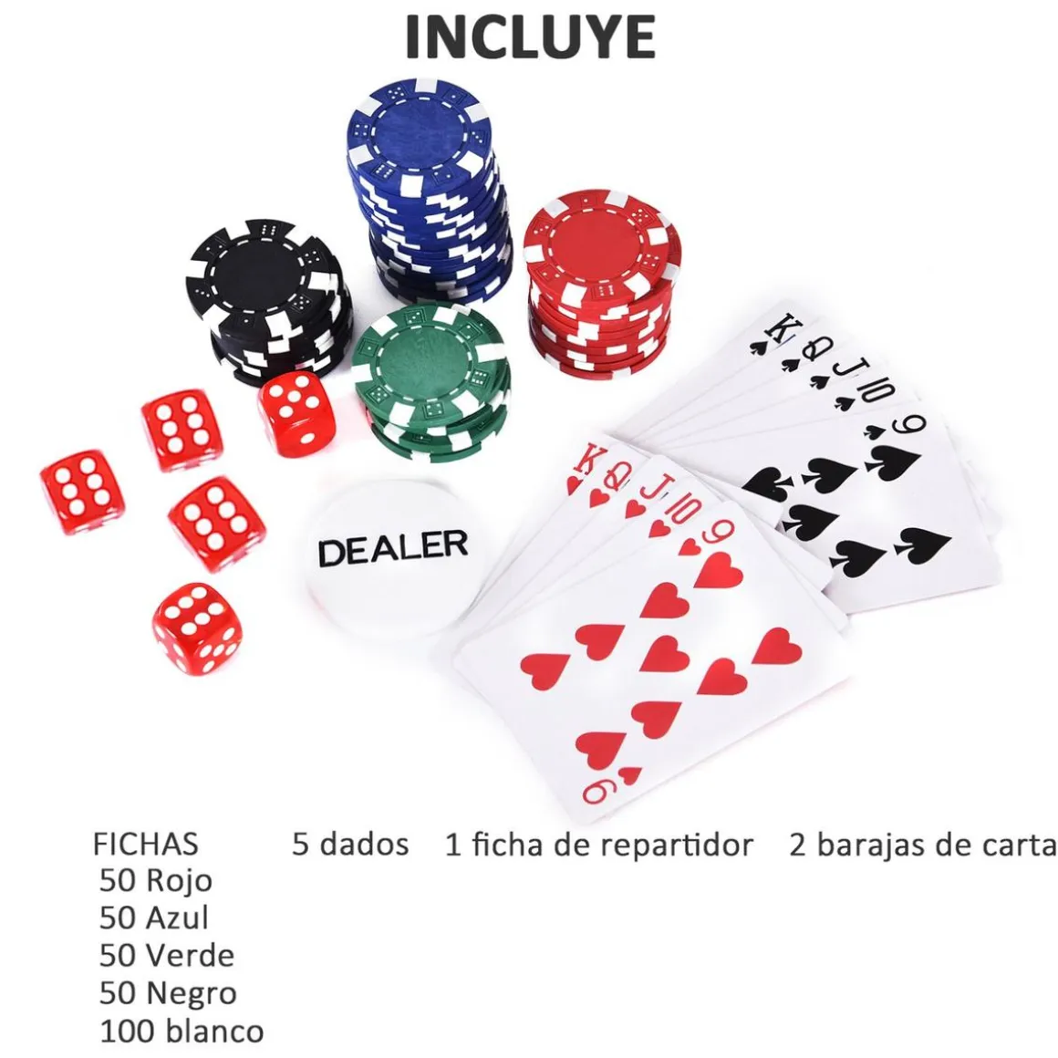 - Incluye 50 fichas negras, 50 fichas rojas, 50 fichas azules, 50 fichas verdes, 5 dados, 1 ficha de crupier y 2 barajas de cartas.