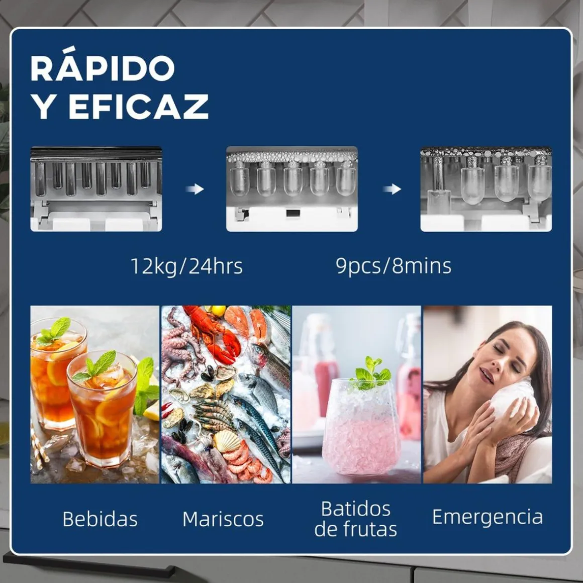 - Produce 12 kg de cubitos de hielo cada 24 horas, 9 cubitos de hielo cada 8 minutos.