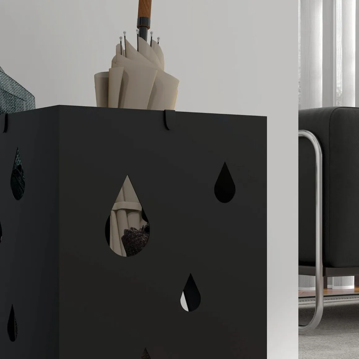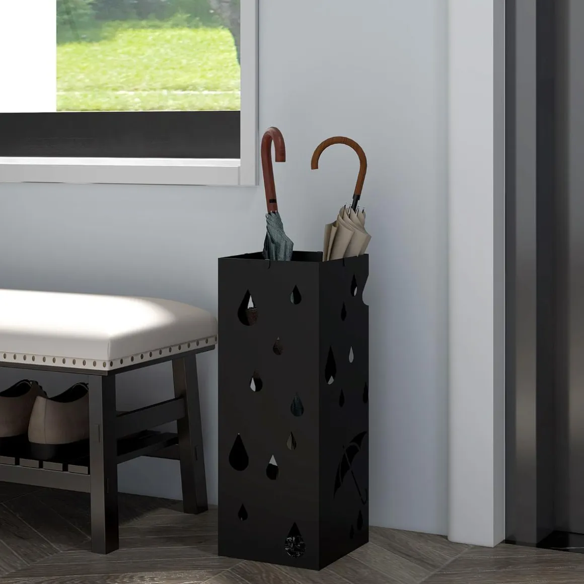 - El diseño calado añade elegancia y tus paraguas mojados pueden secarse rápidamente.