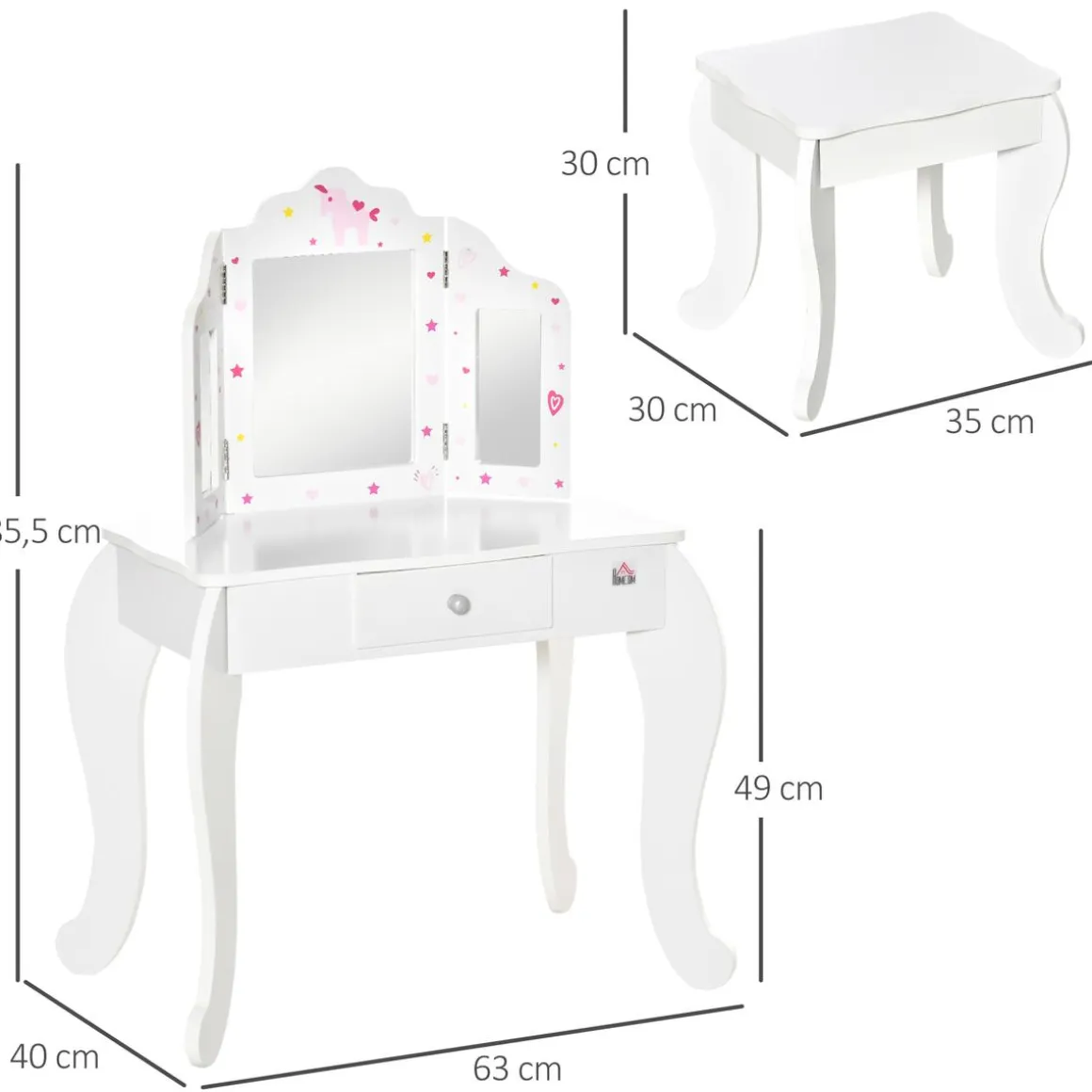 Homcom – Tocador de madera con taburete, un tocador infantil con triple espejo, cajón y taburete.