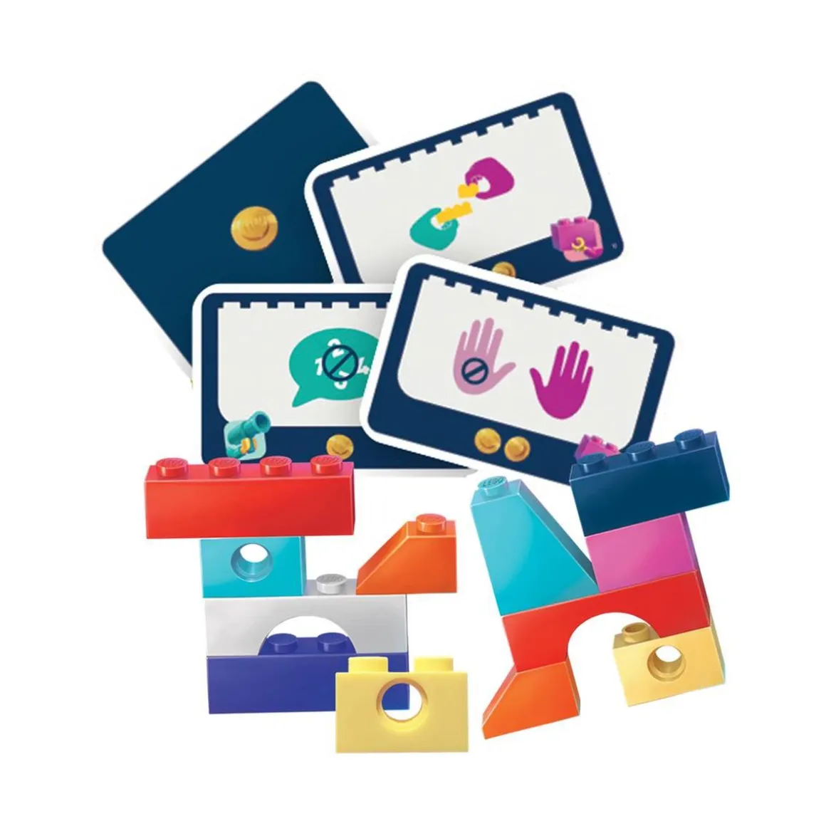 El juego incluye 48 ladrillos LEGO, 92 tarjetas de forma, 20 tarjetas de desafío, un reloj de arena y un reglamento, ofreciendo horas de diversión y desafíos diferentes en cada partida. Su mecánica dinámica permite desarrollar habilidades de colaboración, resolución de problemas y pensamiento rápido, fomentando la interacción y la diversión entre jugadores.