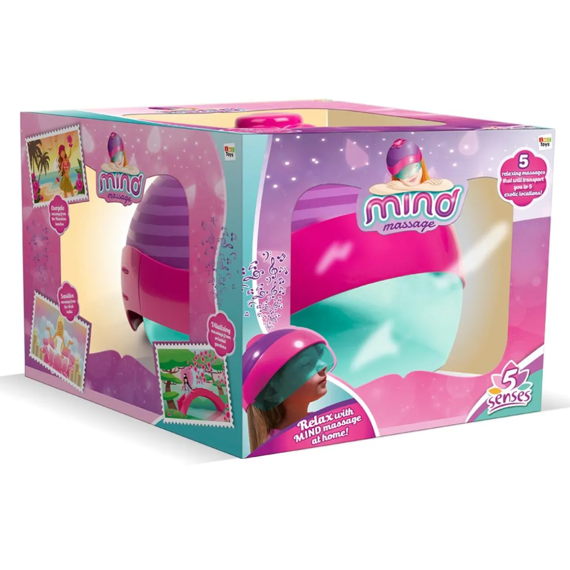 El Mind Massage es un casco de masajes con música para un relax absoluto. Contiene 5 masajes que se realizan con vibraciones en las distintas zonas de la cabeza, con diferentes intensidades y velocidades, que te trasladarán a 5 lugares exóticos. Podrás elegir entre masaje equilibrante de la selva amazónica, sensitivo de los baños árabes, armonizante de las montañas tibetanas, energético de las playas hawaianas o vitalizante de los jardines orientales, además van acompañados de música para mayor relajación. ¡Acércate al paraíso con Mind Massage! Funciona con 4 pilas AA. Pilas NO incluidas. Edad recomendada: +3 años.
