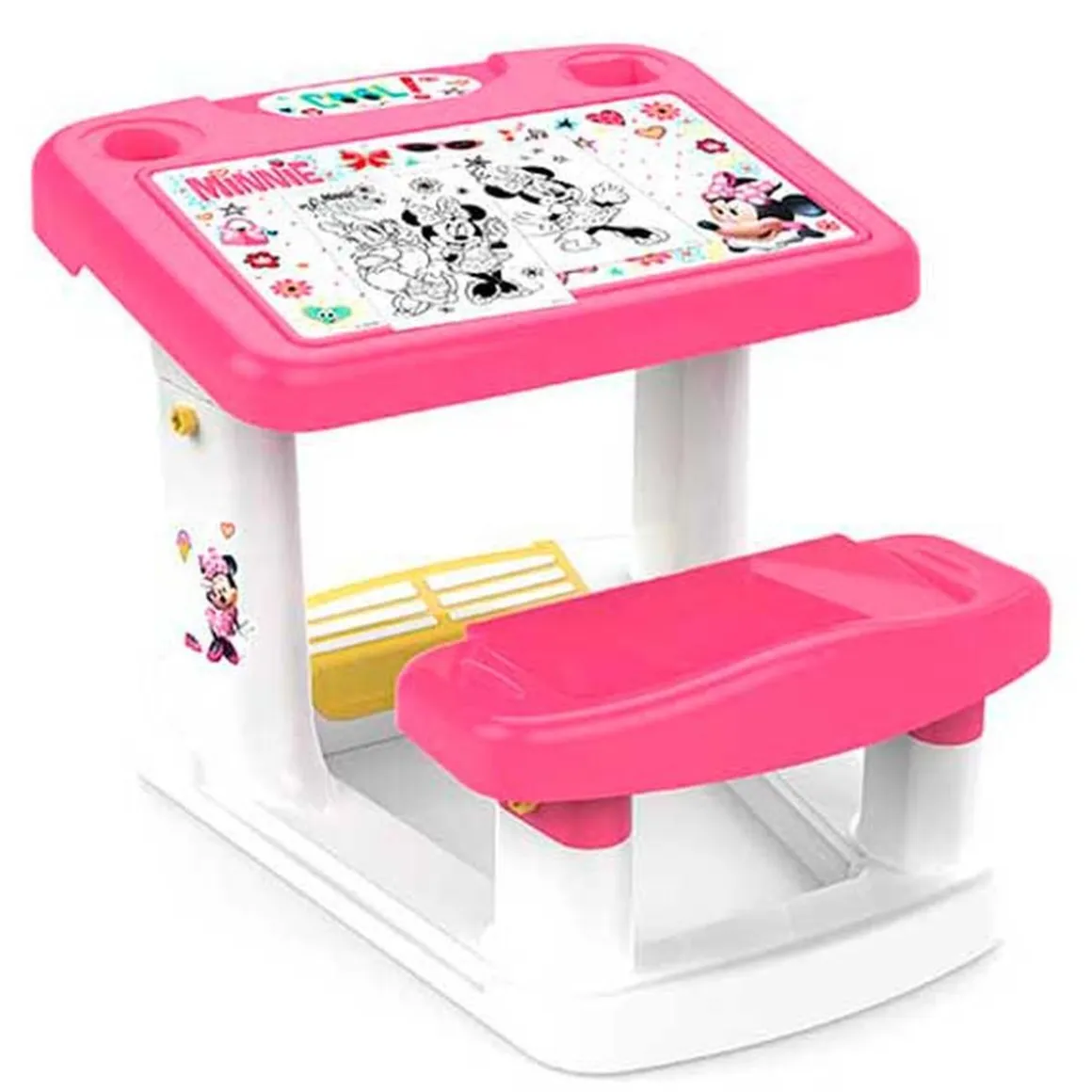 Pupitre infantil de Minnie para aprender, crear e imaginar sin límites. El pupitre incorpora una gran superficie de trabajo y compartimentos para guardar todo el material de dibujo y escritura. Se incluyen láminas de Minnie para colorear. Fabricado en plástico de gran resistencia y durabilidad, apto para niños y niñas a partir de 2 años.