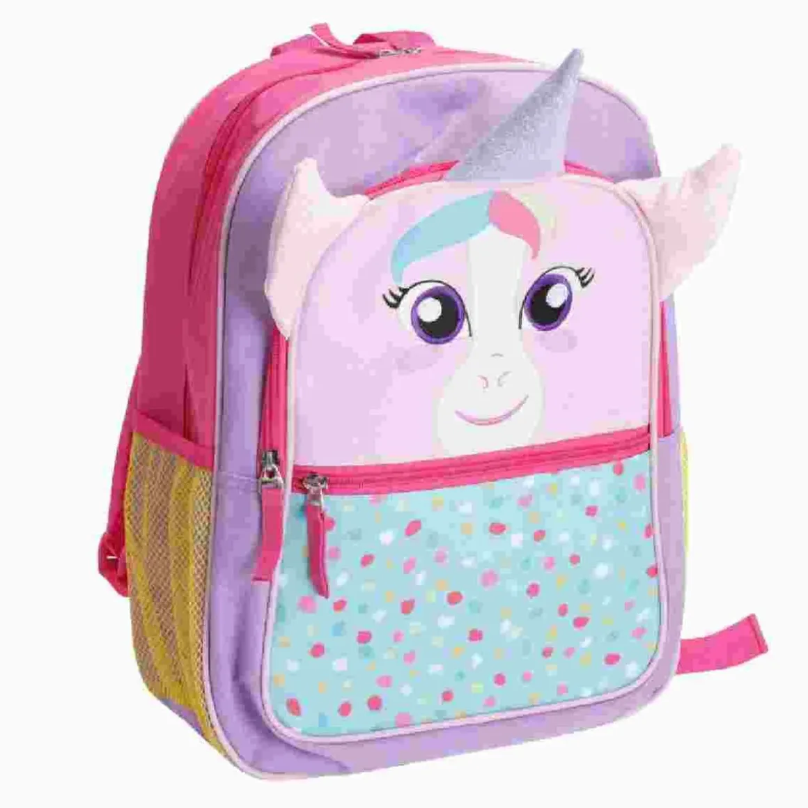 Esta colorida mochila es perfecta para los niños que aman los unicornios, ya que presenta un unicornio con orejas y cuerno brillantes.